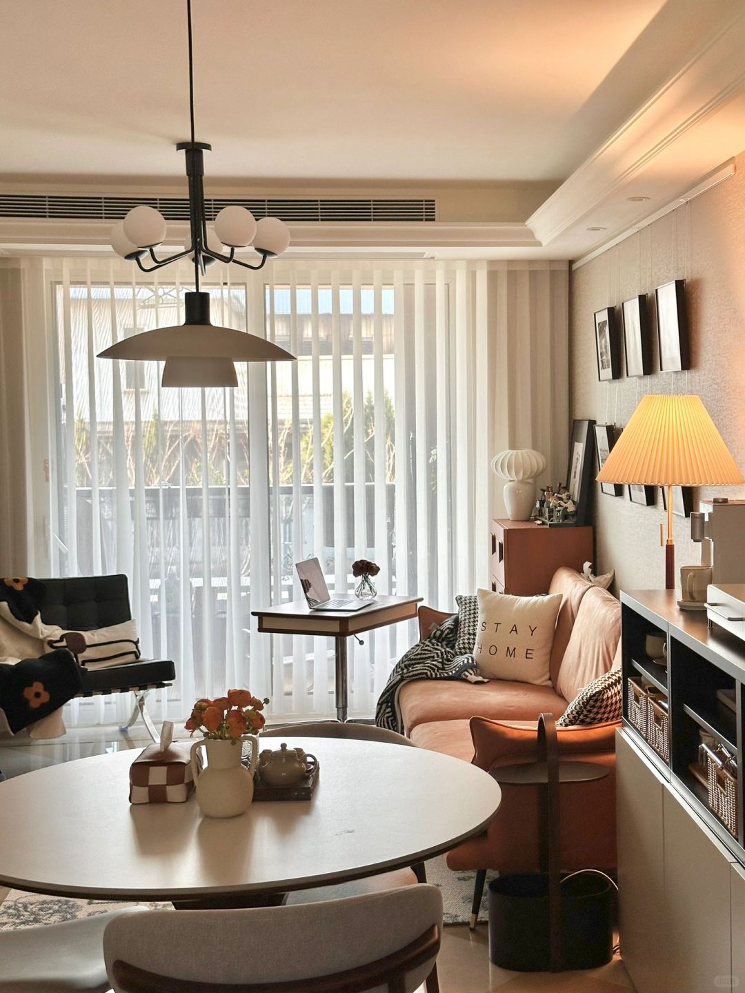 ✔️白色岩板圆桌+黑色米灰色餐边柜的布局。