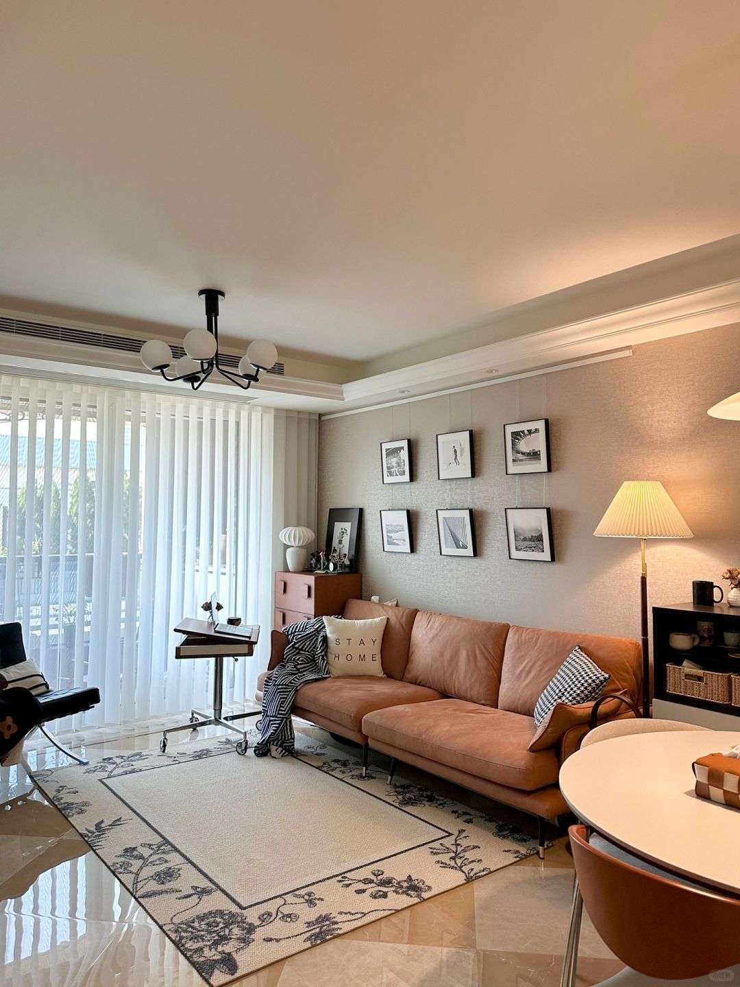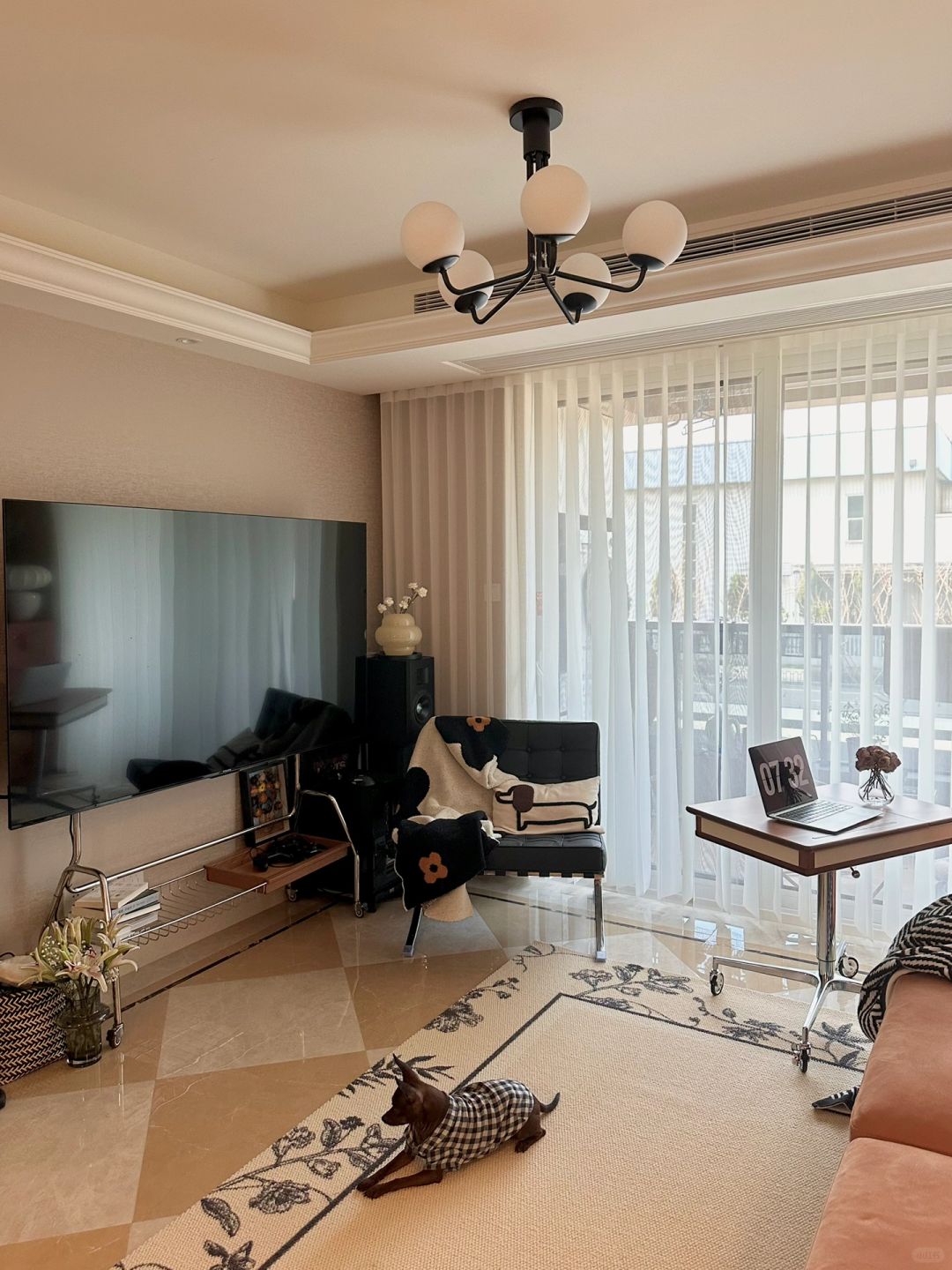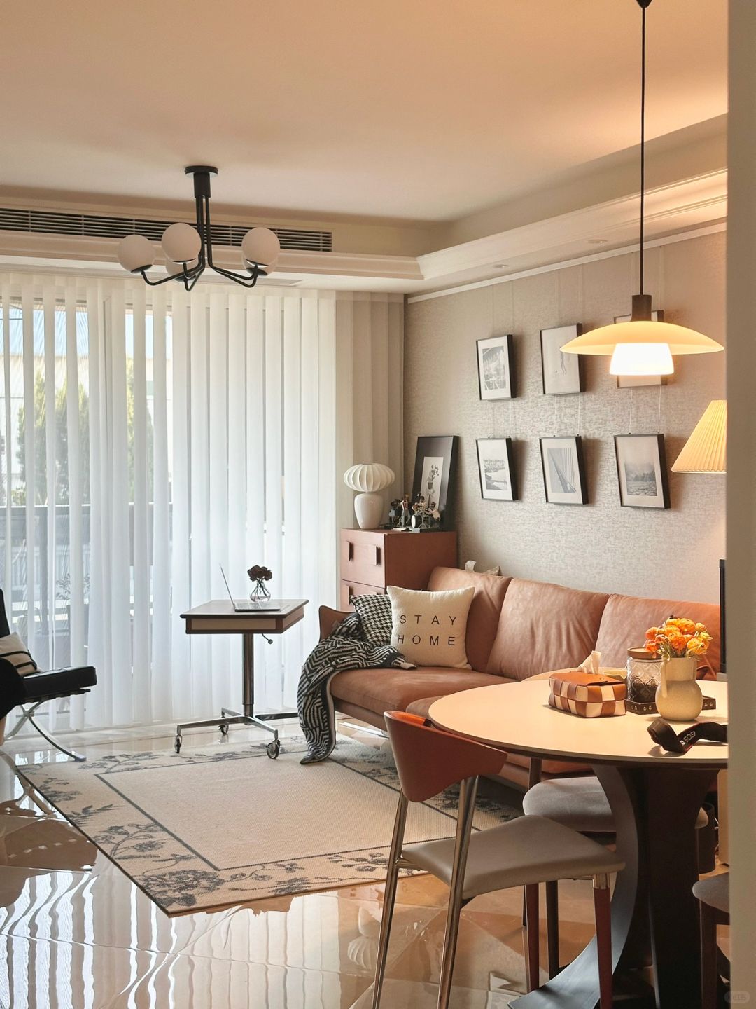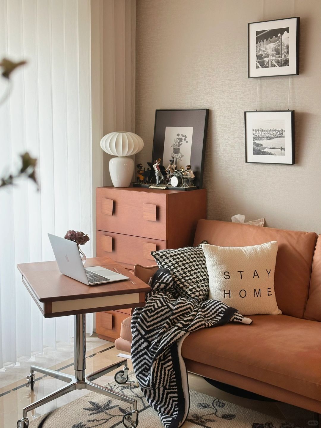 ✔️没有摆放茶几,沙发旁边放个升降边几还能办公