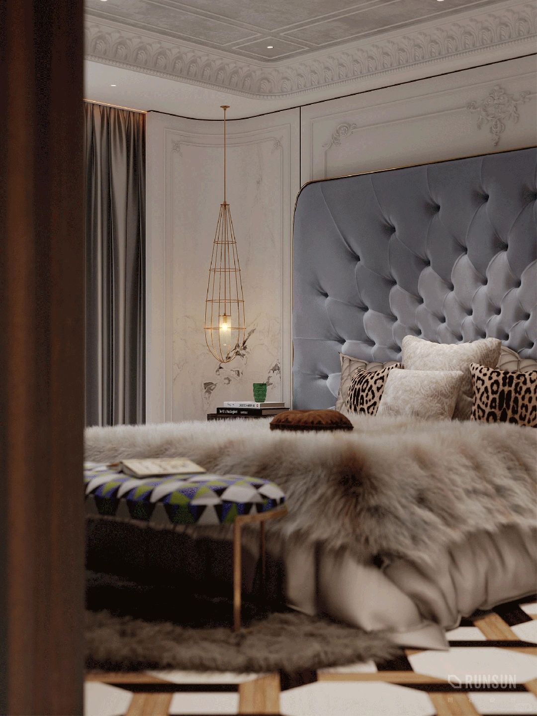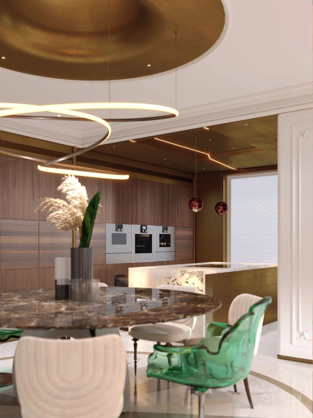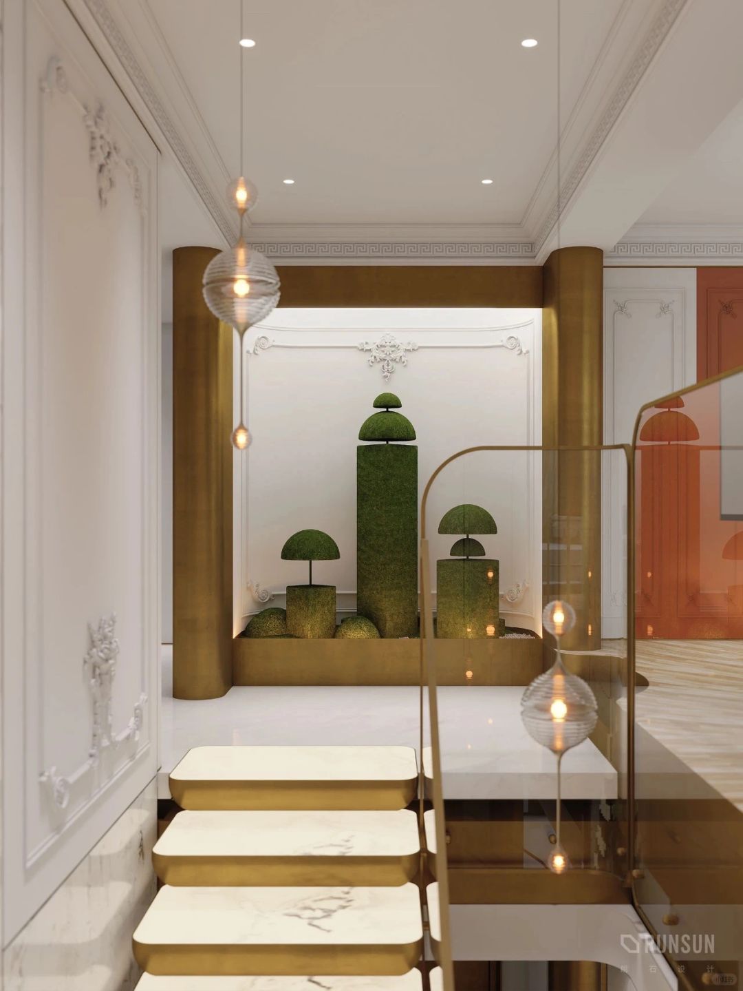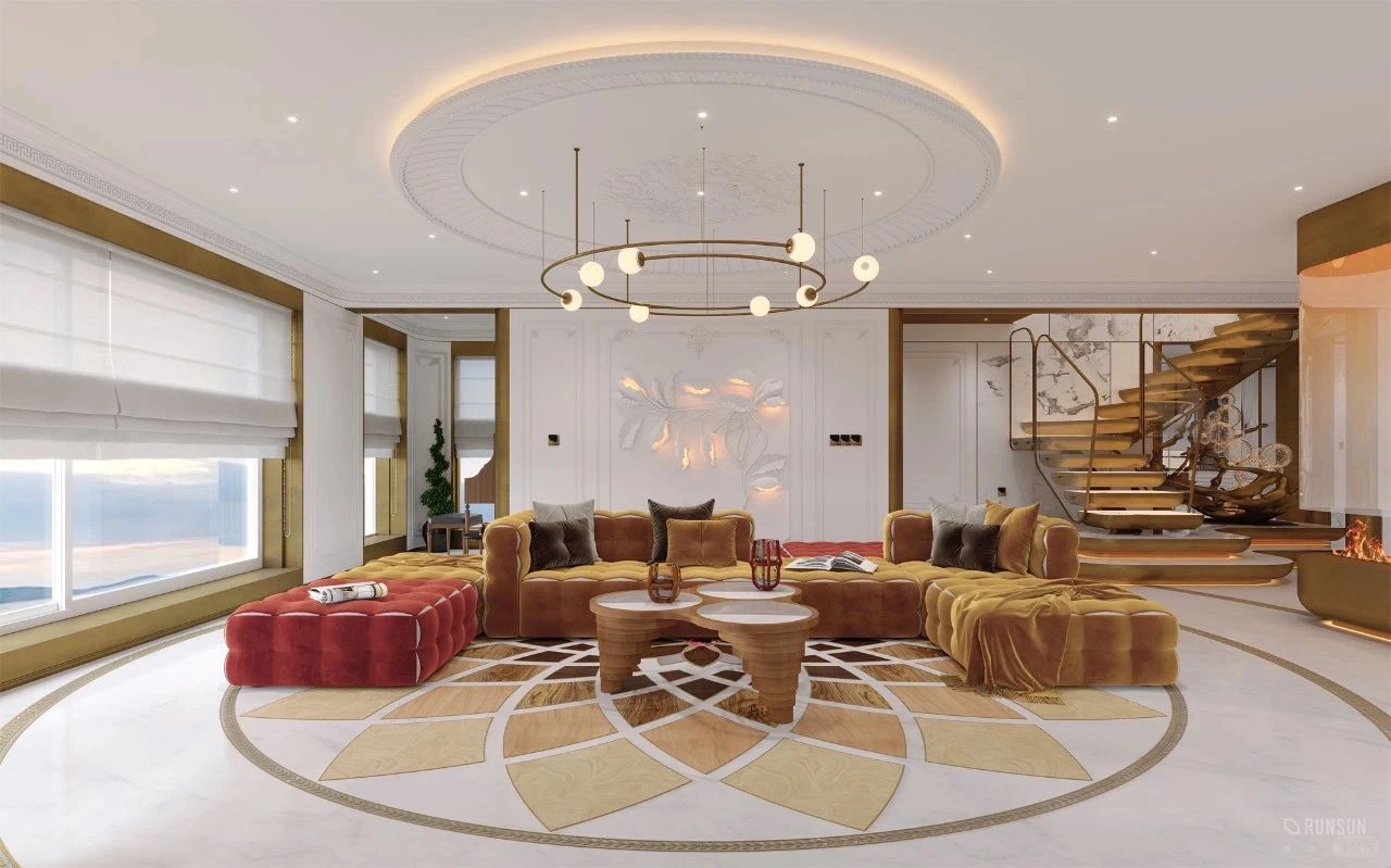 NEWCASE.温州瓯江峯汇私宅 在瑰丽的装饰与旖旎的氛围中 蕴含着对生活与美学的独特理解 当现代主义邂逅古典浪漫 在家这个小小场域中 一场宏大的新古典主义复兴悄然进行 拒绝了常规的地毯铺设 选择石材与木材碰撞的地面拼花 在“新”与“旧”之间保持了微妙的平衡感 空间也显得愈发深邃 室内点缀的亮眼金色与胡桃木色的结合 是奢华 是优雅 是交织的精致美感 空间大量运用了欧式元素的家居 每一件陈设都经过精心斟酌 住在这个家里,你便成了艺术家