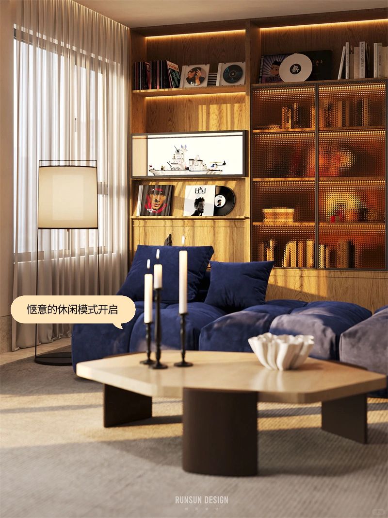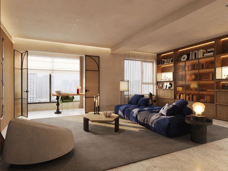 ADDRESS. 温州瓯江峯汇私宅 本案是舒适平层格局,业主喜好惬意休闲的居家氛围,我们着重“慢”节奏,打造舒适宜居的居家空间。我们没有砸掉阳台墙体,而是选择将书房移置阳台,扩大客厅的面积,同时把业主闲置的阳台打造成更符合生活习惯的现代书房[哇R] 阳台与客厅衔接处用水晶罗幕般隐约的玻璃隔开。玻璃移门开、合,空间也能实现1房多用了![自拍R]