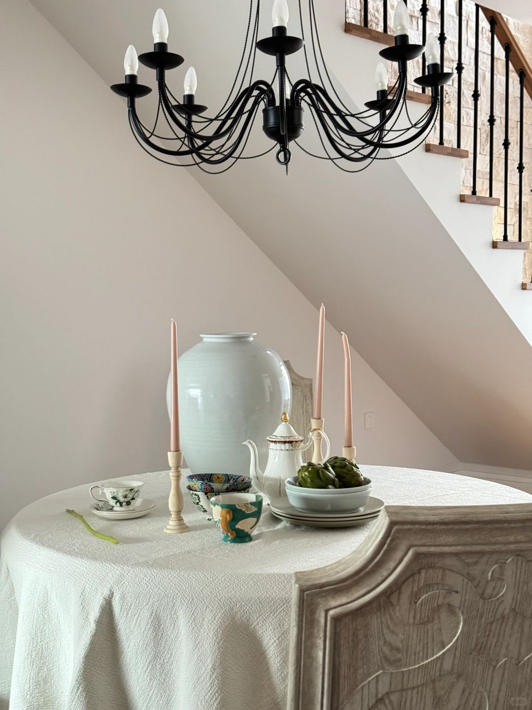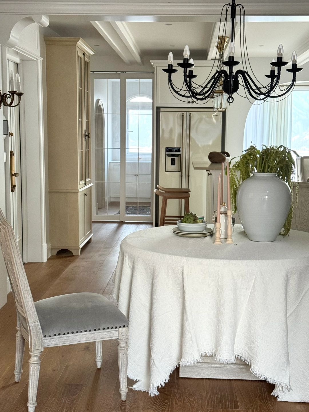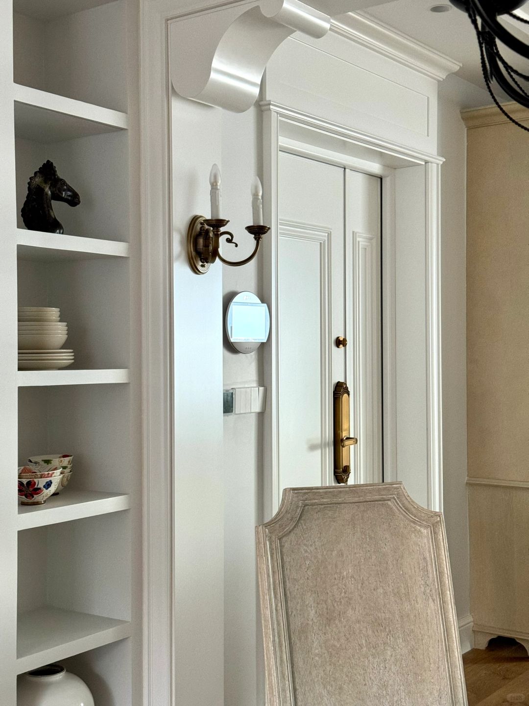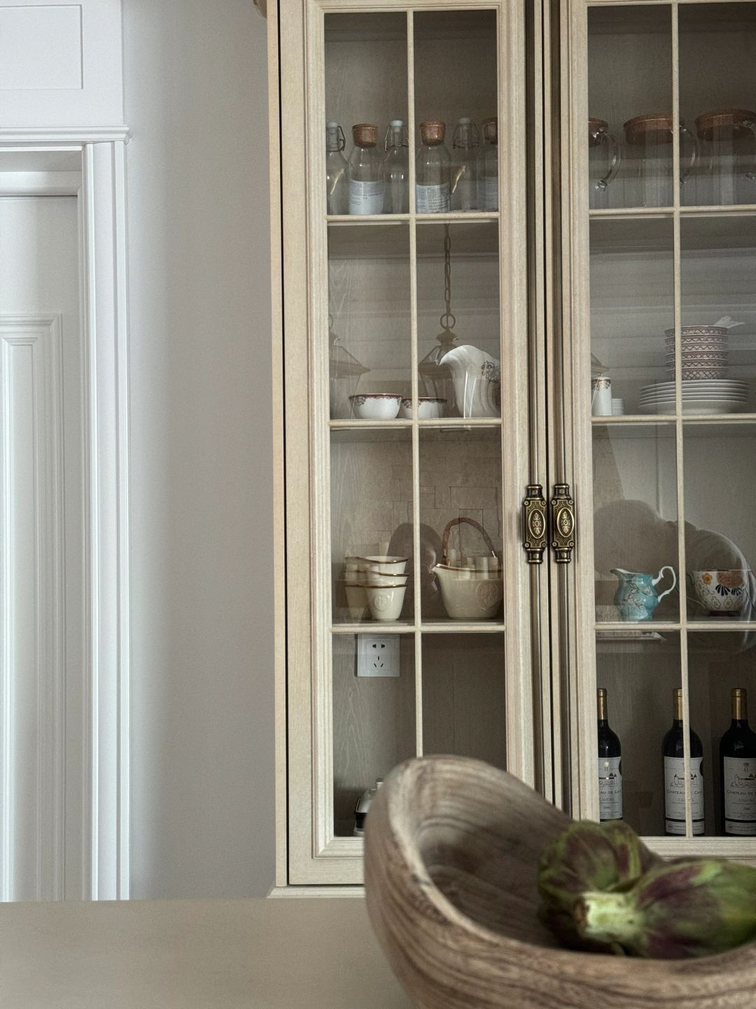 圆餐桌旁设计了氛围感壁柜,可以用于收纳杂物、摆放装饰品。展示的空间无处不在,精致的摆件从此不用藏在箱中落灰。随着窗外暖阳落入屋内,圆桌也随之成为浪漫氛围的中心