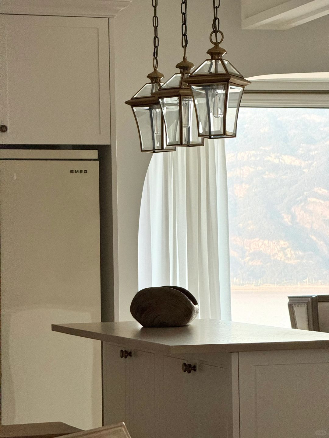 墙面大面积做减法,浓浓美式风格的柜子辅以曙光色的亮眼点缀,岛台是温暖的浅色,开放式布局更添古朴自然气息,搭配木制高凳实用耐看。搭配铁艺的吊链挂灯,复古氛围跃然而出,整个空间充满了质感与格调[氛围感R]