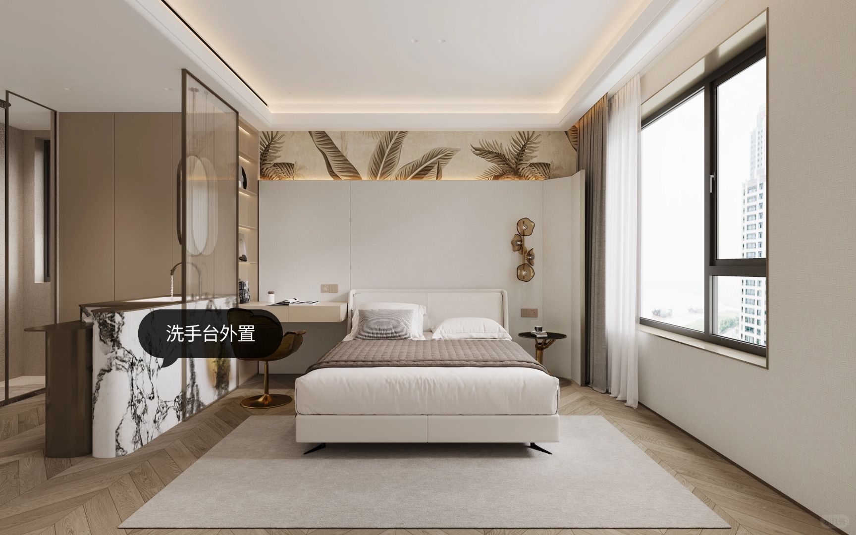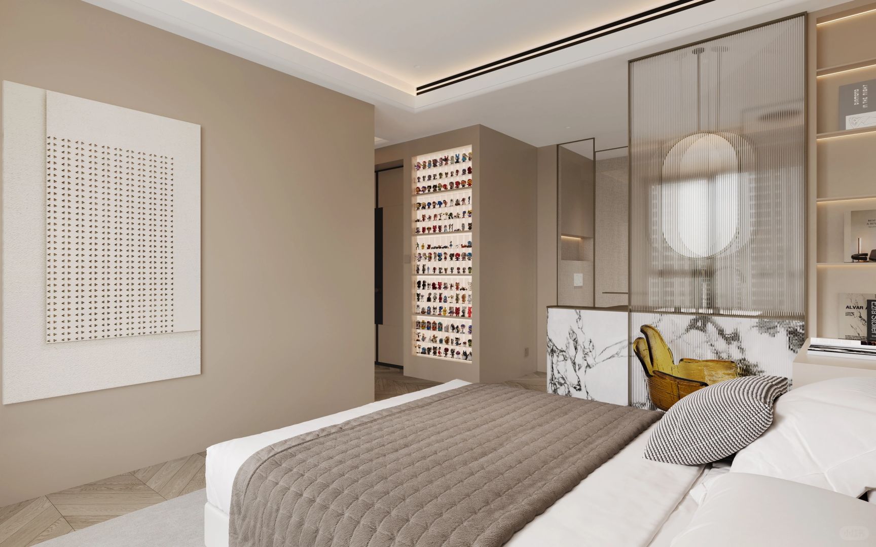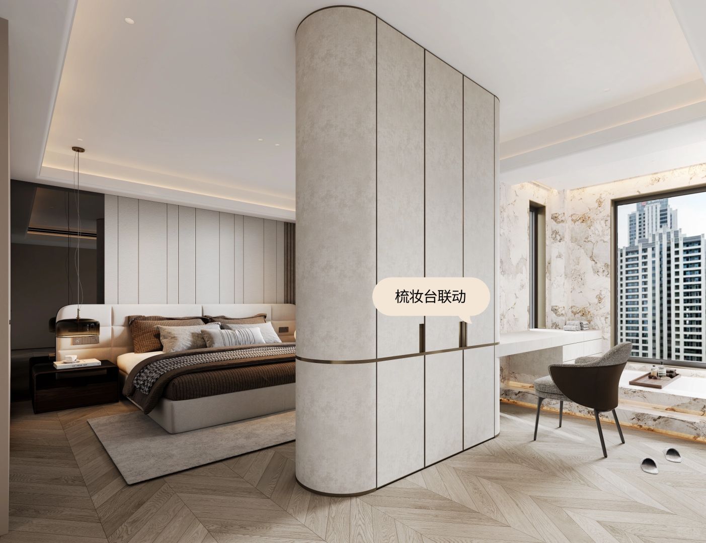 我们以居住使用为中心,将卧室的电视墙设为中心点,围绕电视墙展开一条简单清晰的洄游动线。链接卧室里休息区域与休闲区域的空间,使得宽阔区域内的生活动线更加清晰、明了。简单的活动空间设计也更方便生活上的便捷使用:面对床铺是电视墙、面对走道则是衣柜。一体化设计,即合理规划每一寸空间,又能让空间不单调乏味~