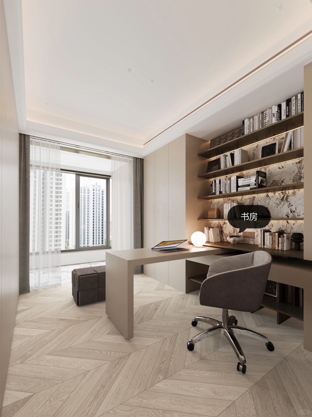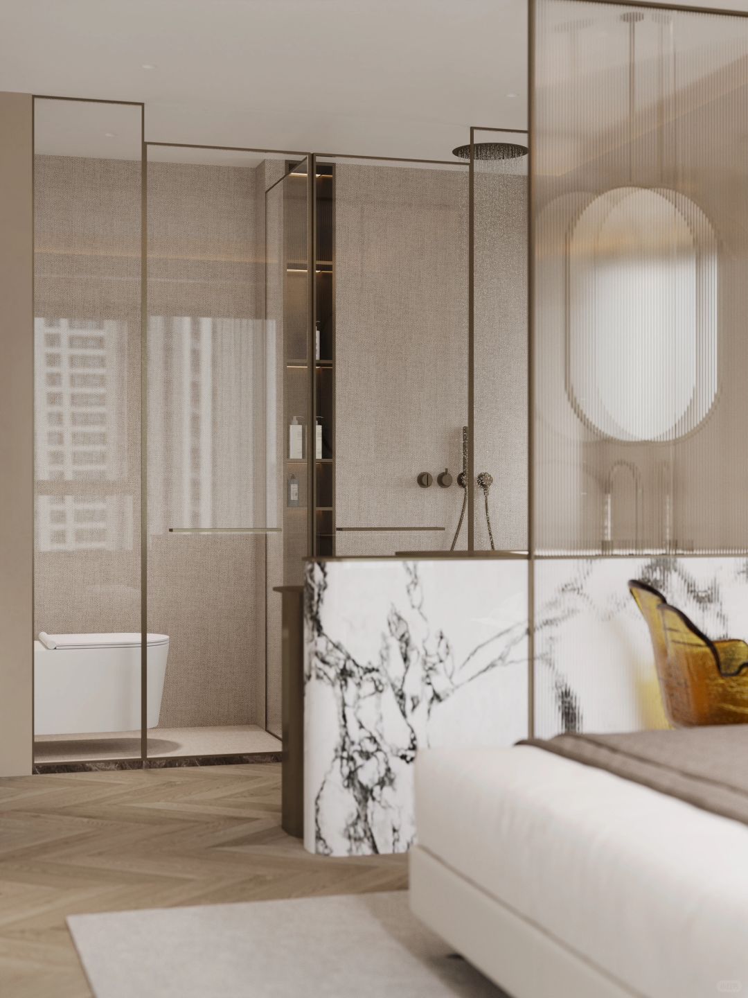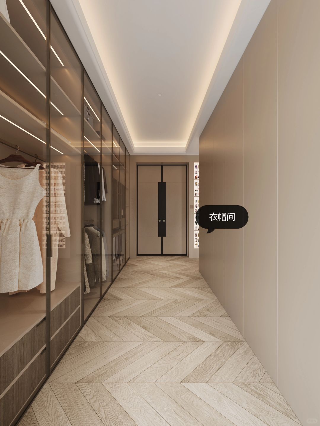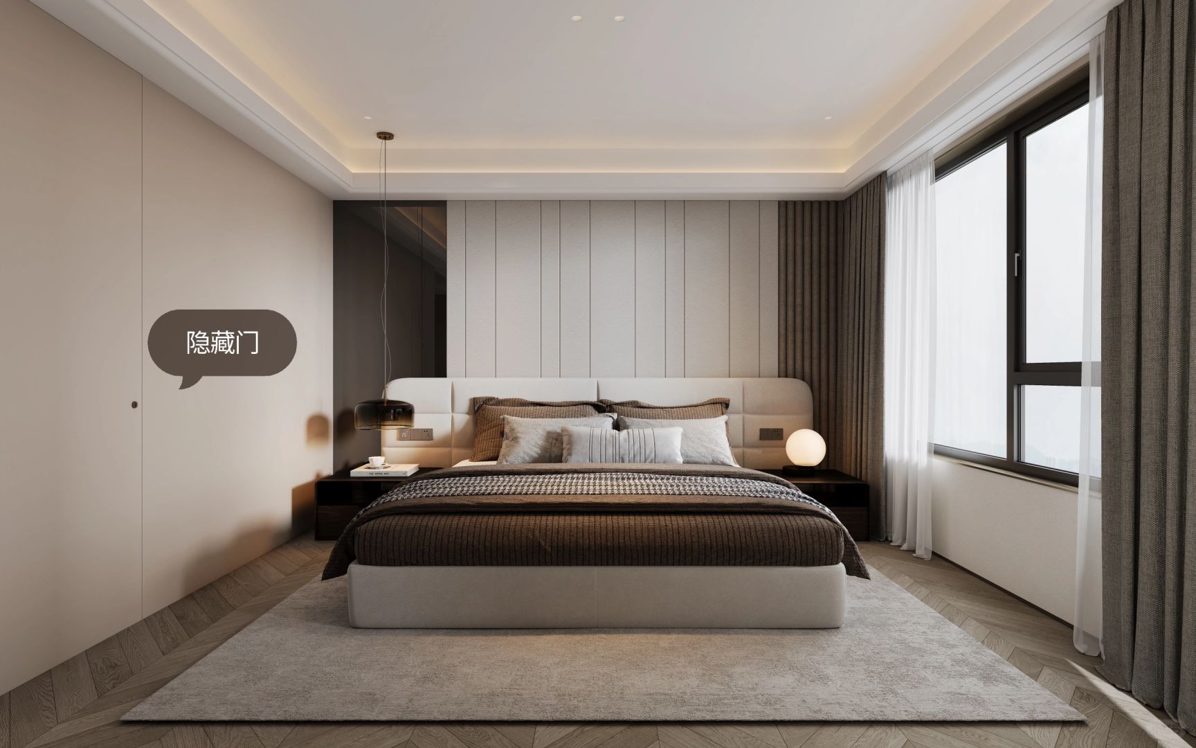 我们以居住使用为中心,将卧室的电视墙设为中心点,围绕电视墙展开一条简单清晰的洄游动线。链接卧室里休息区域与休闲区域的空间,使得宽阔区域内的生活动线更加清晰、明了。简单的活动空间设计也更方便生活上的便捷使用:面对床铺是电视墙、面对走道则是衣柜。一体化设计,即合理规划每一寸空间,又能让空间不单调乏味~