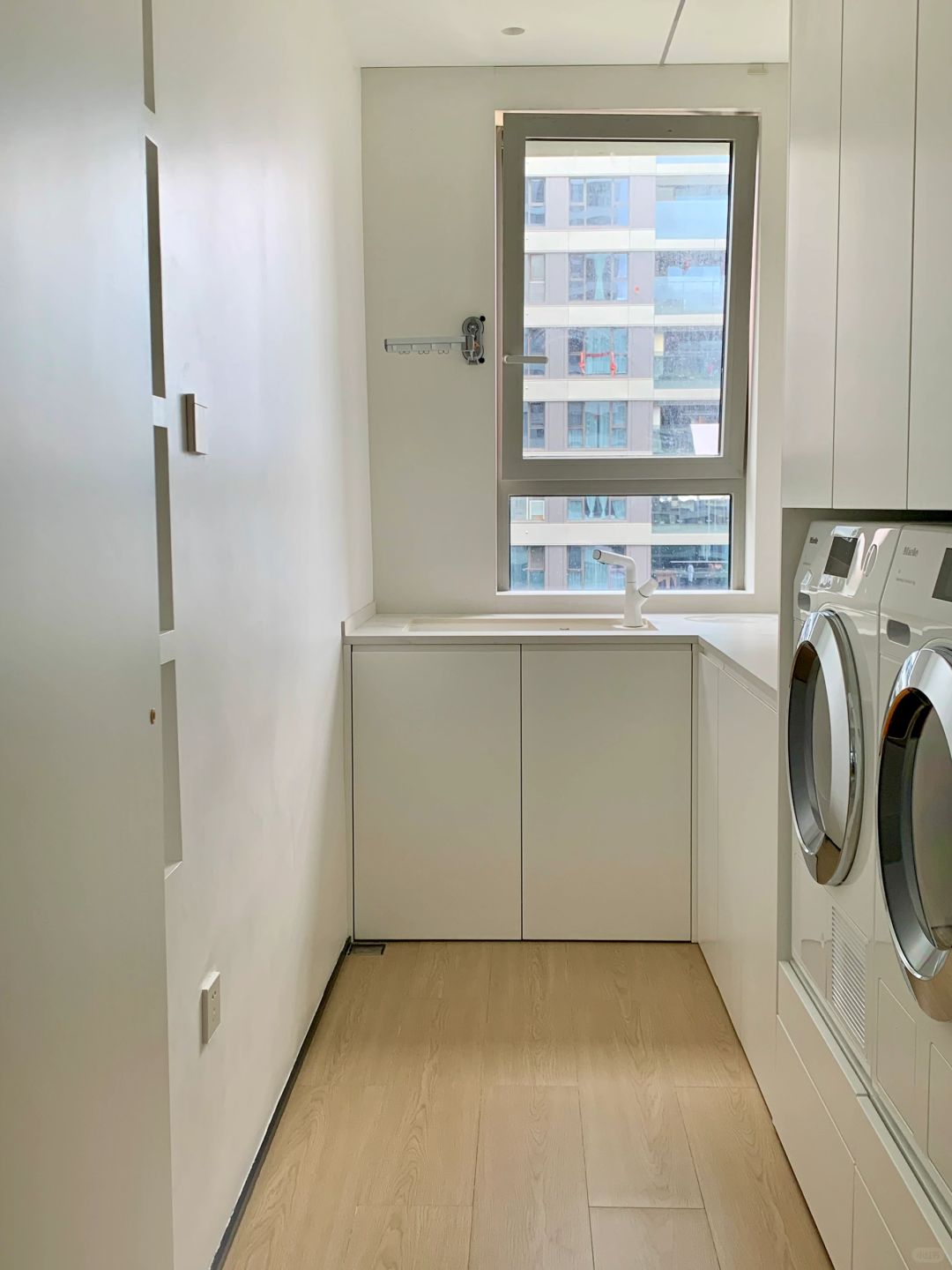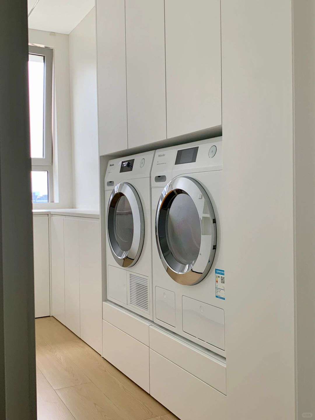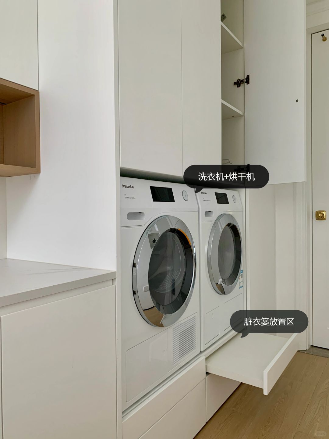 我们在6㎡的有限空间隔出了一间洗衣房,洗衣机+烘干机+收纳柜+手洗区+叠衣区+不用弯腰的脏衣篓放置区,打造出完美符合家庭使用标准的洗衣房!