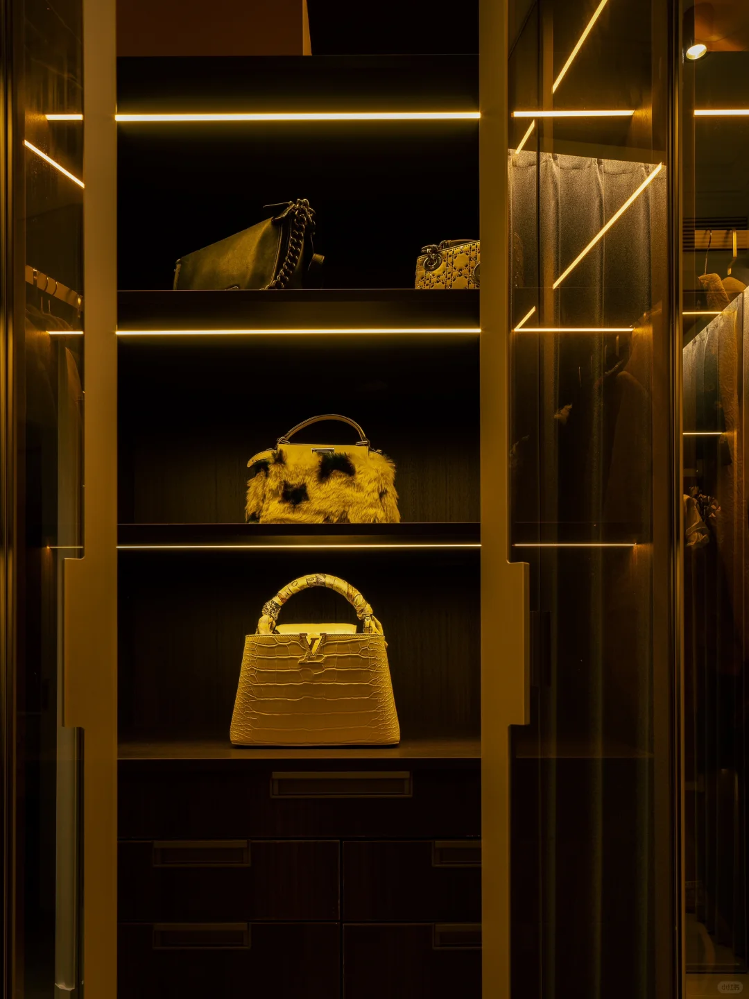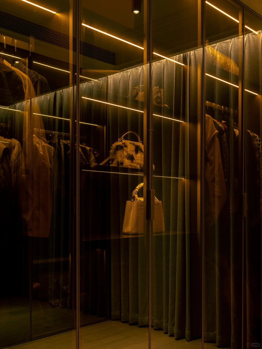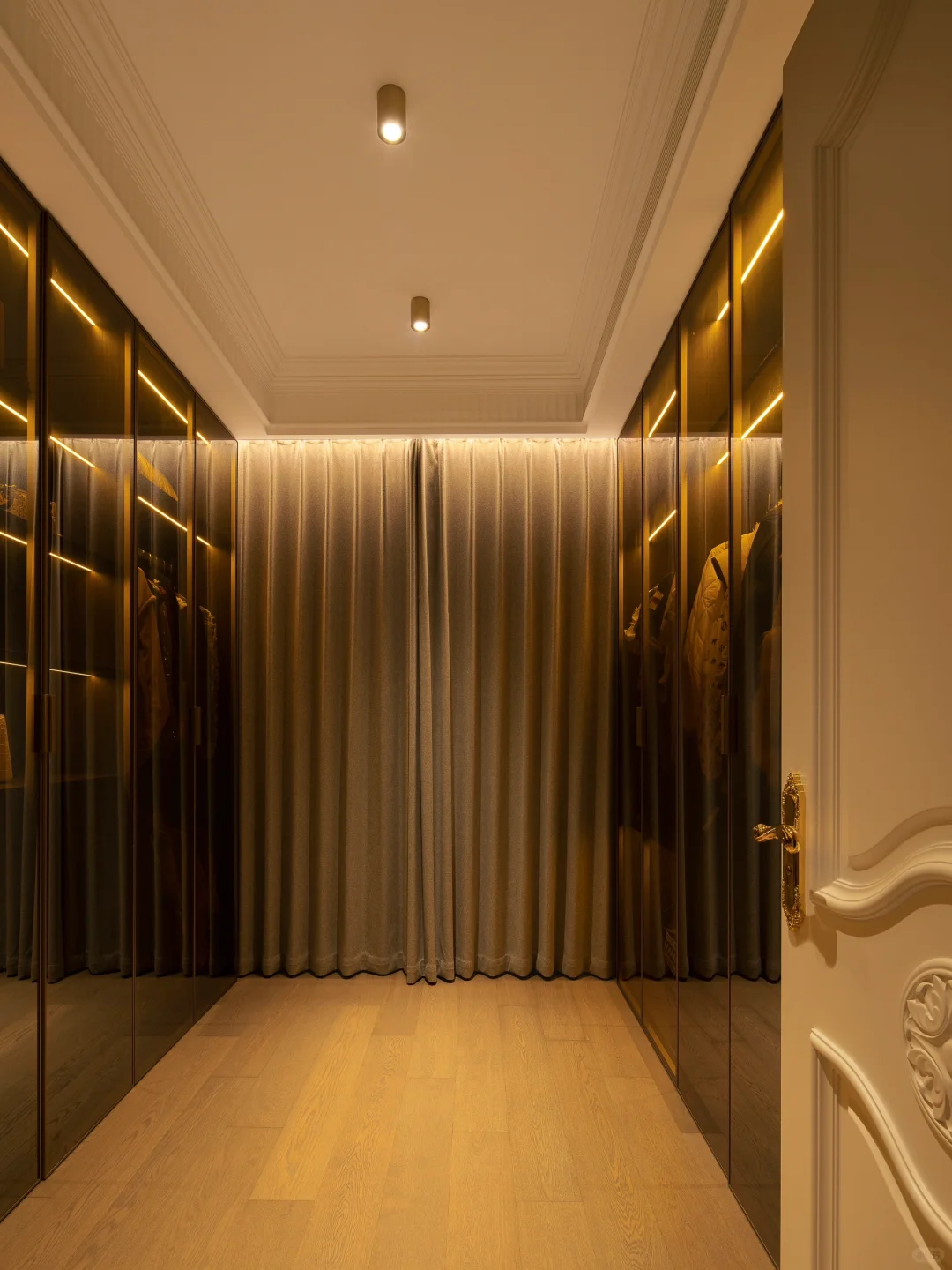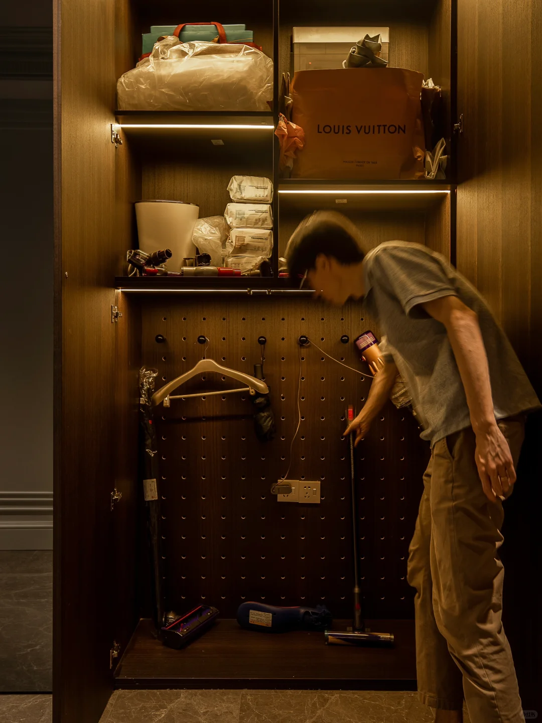 ADDRESS.温州翡翠天地私宅 本案业主是收纳重度爱好者!基础需求中有一个容量够大的衣帽间。我们着手精装二改后舍弃小卧室空间,修改成一个独立的衣帽间。衣帽间外的转角处空置过大,我们结合业主的收纳需求,将门外一平米的小空间设计成可以置放家用工具的储藏室[派对R]储藏室的“门”则选用折叠门,不仅设计简单且好推拉,可以完全将储藏室敞开以便搬取各种物品。而室内走廊的储藏柜也设计上了洞洞板,可以更好的细分储存物品的空间。