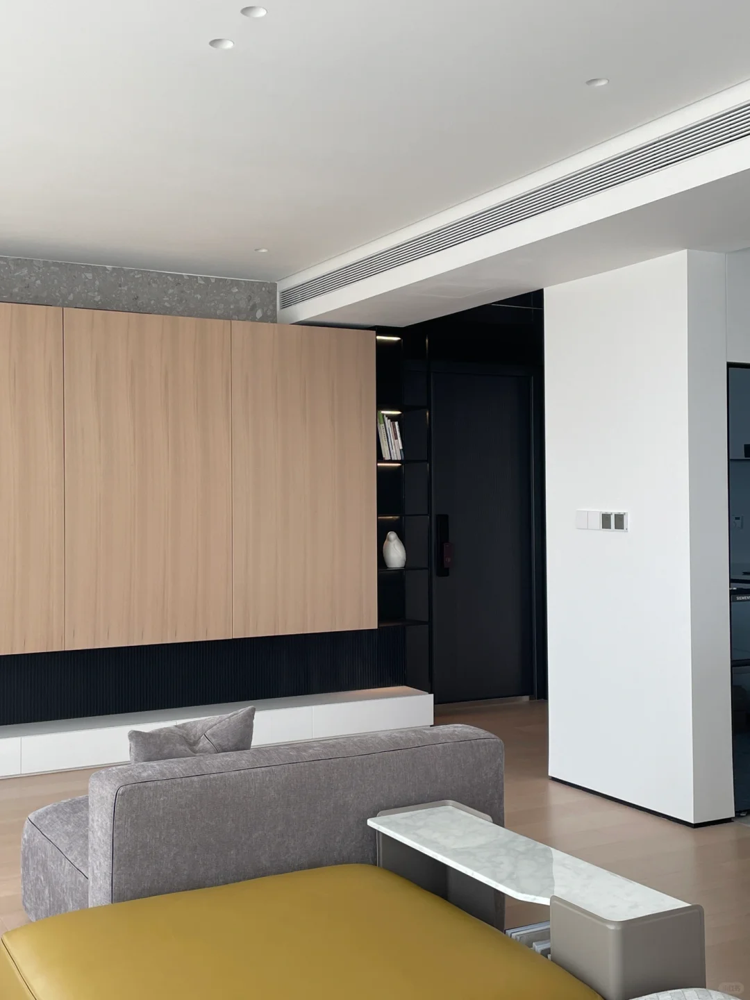 ⚫️电视柜的部分被我们巧妙地运用“巴士移门”藏了起来。移门打开,显现的是是暗藏其中的电视柜+书柜的收纳组合,关闭时就是一面整齐的墙面,极简工艺没有缝隙才能把美丽放大。旁边再做开放式金属置物架,与入户门相连,既能做到放置随身小物件,又能起到展示摆件的美观作用。
