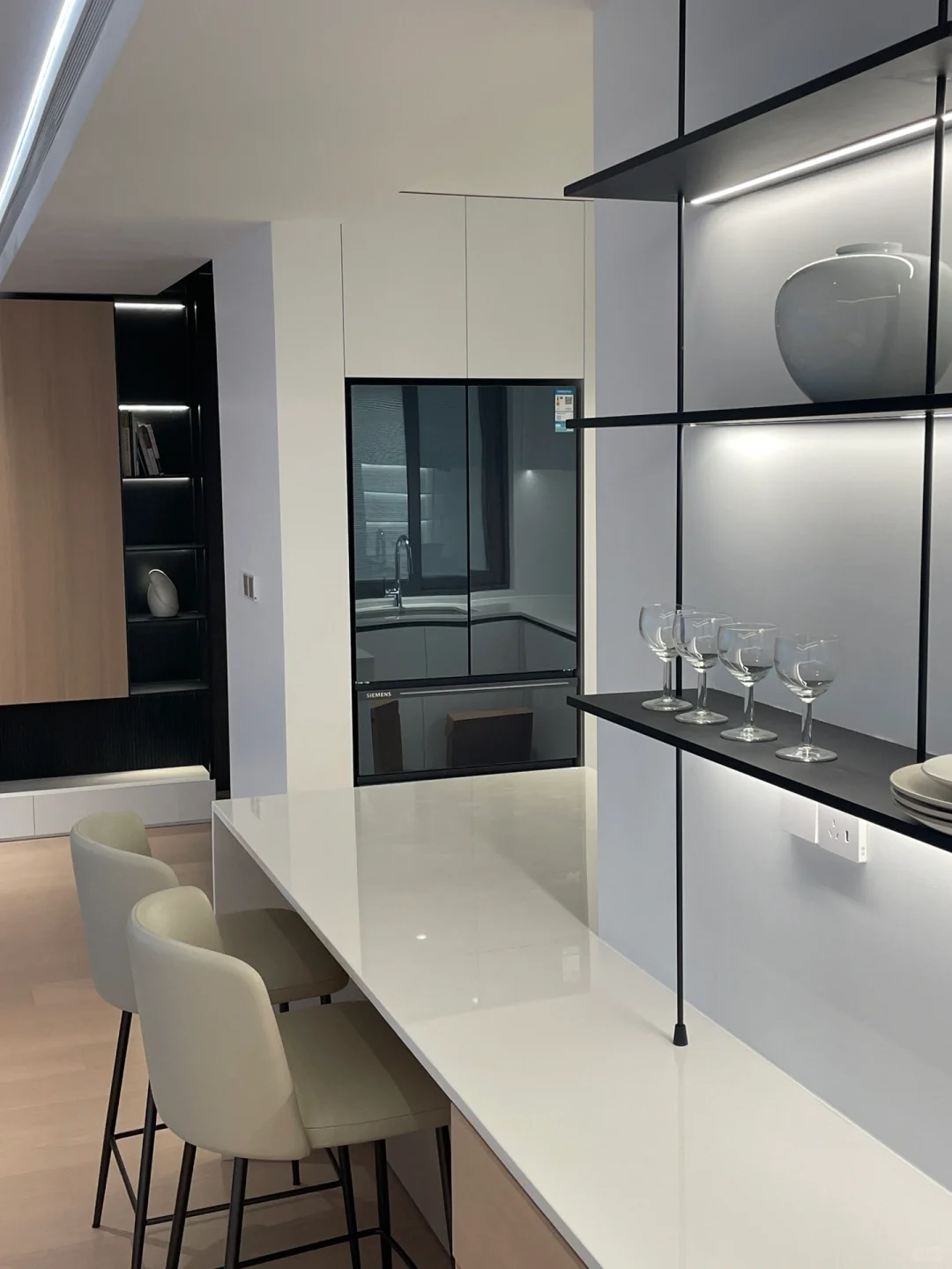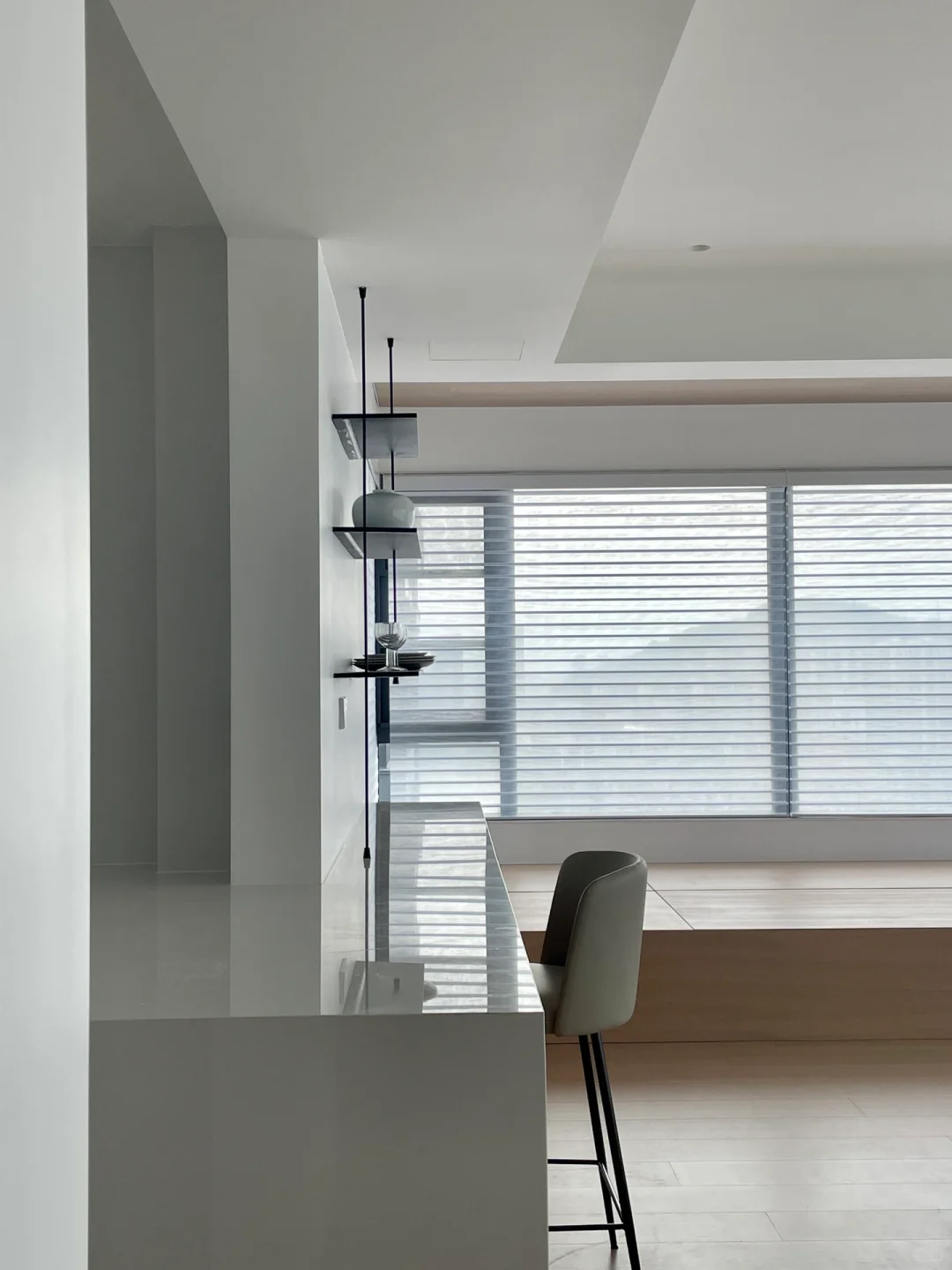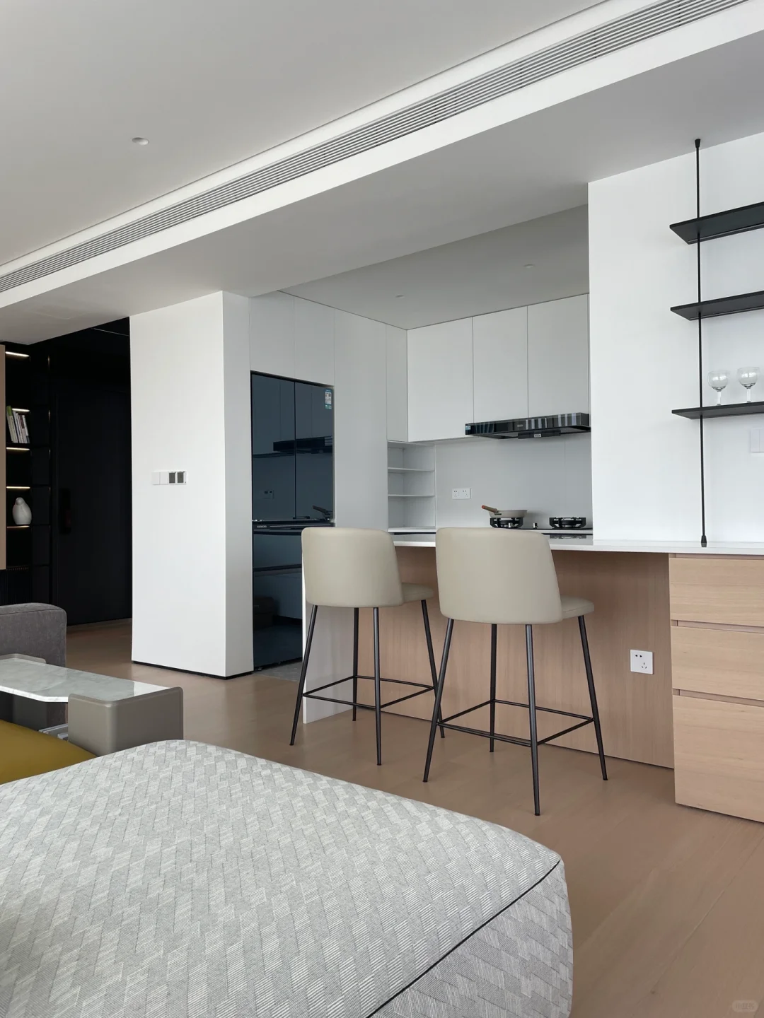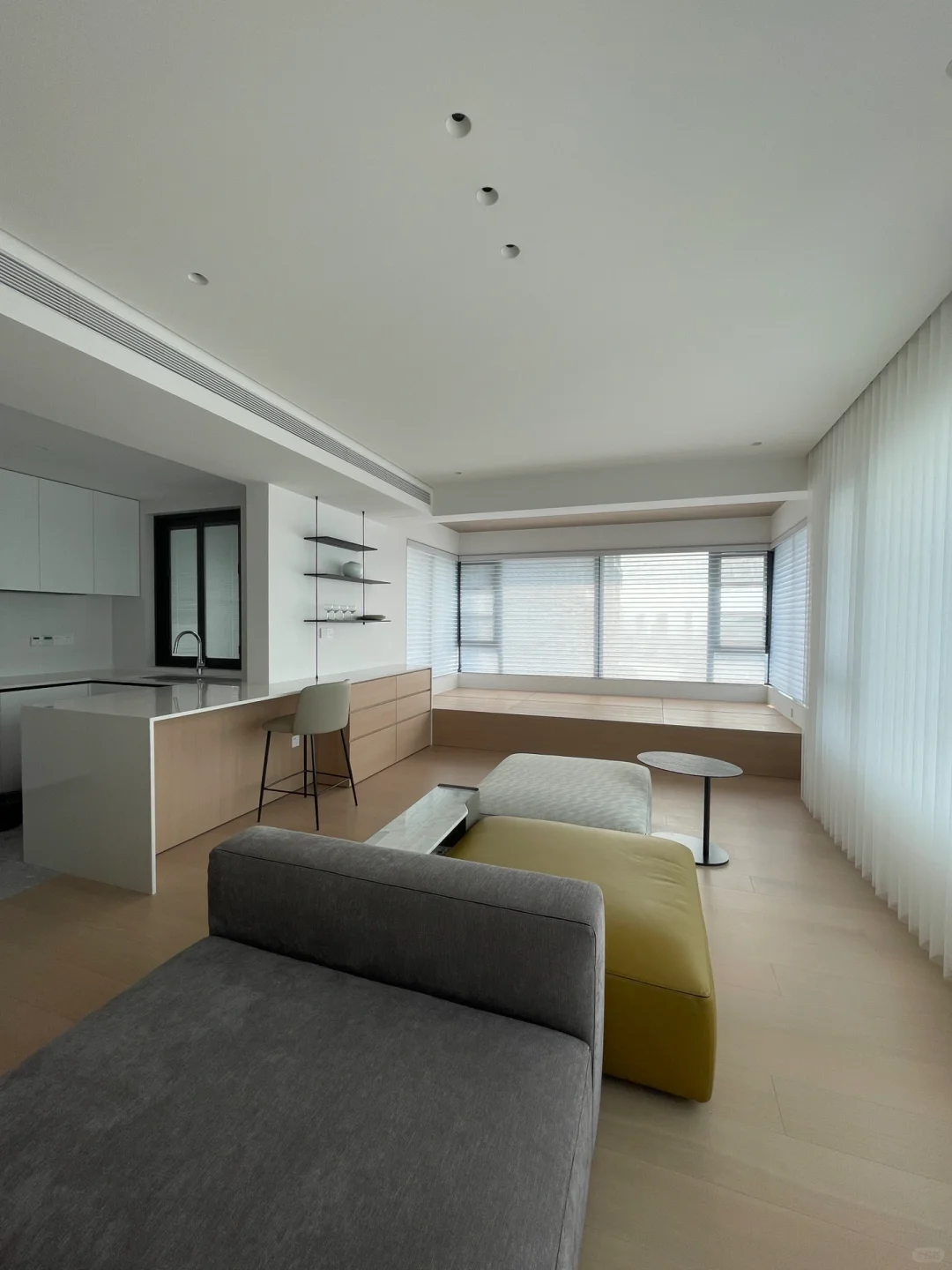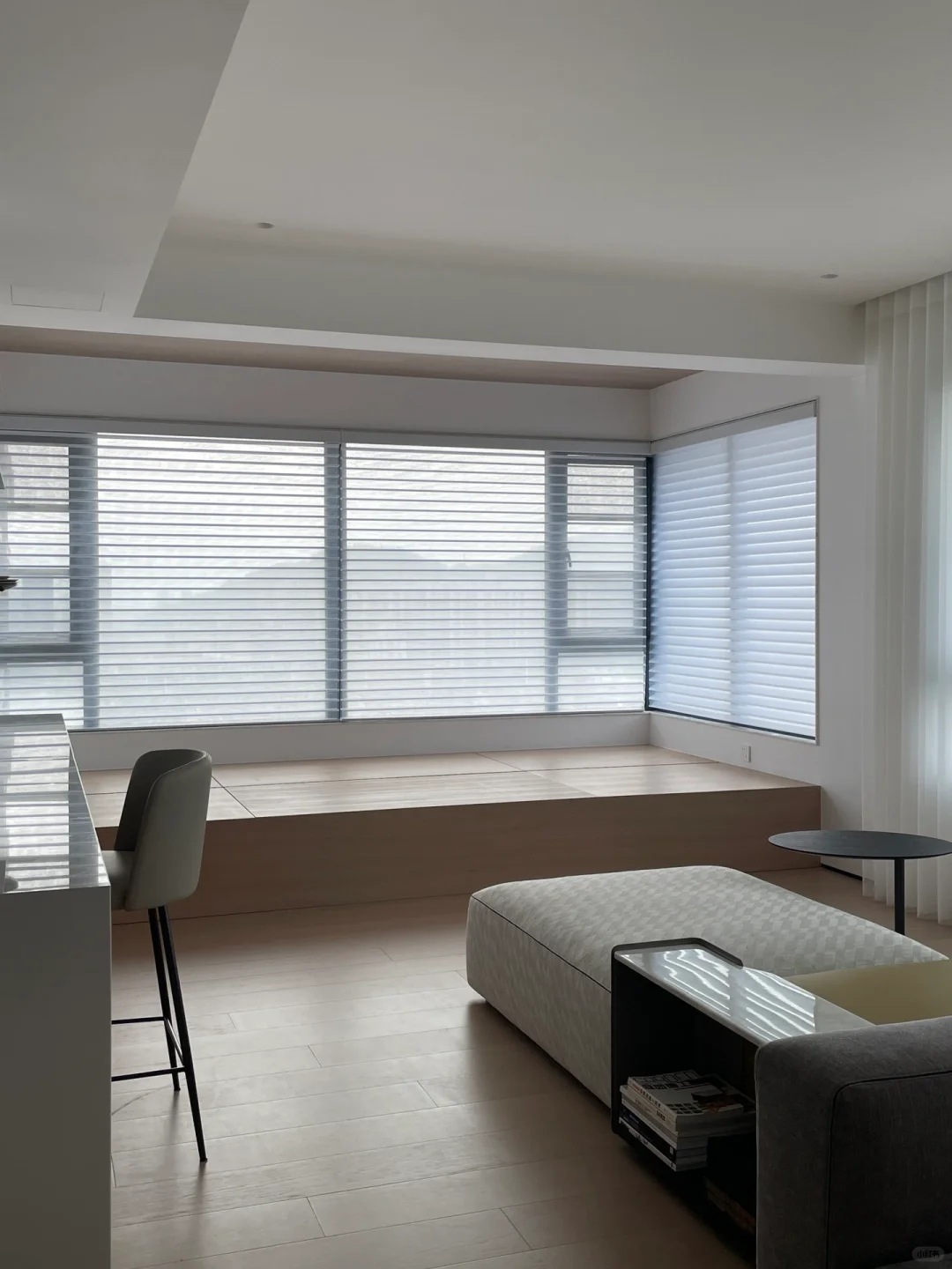 ⚫️窗边是榻榻米的娱乐场所。香格里拉帘掩盖不住窗外风景无限;而表面平平无奇的榻榻米飘窗下则暗藏着一个自动升降“麻将桌”。按下按钮打开桌子,短短几秒休闲区域就能成为居家“棋牌室”。叫上三五好友在家搓麻真是想想都美啊~榻榻米连接着吧台,与餐厨一体。旁边是贴心的收纳窗格,上方是铁艺的展示地带。按压式柜门+整齐有序开放格,收纳生活物品、书籍和藏品。