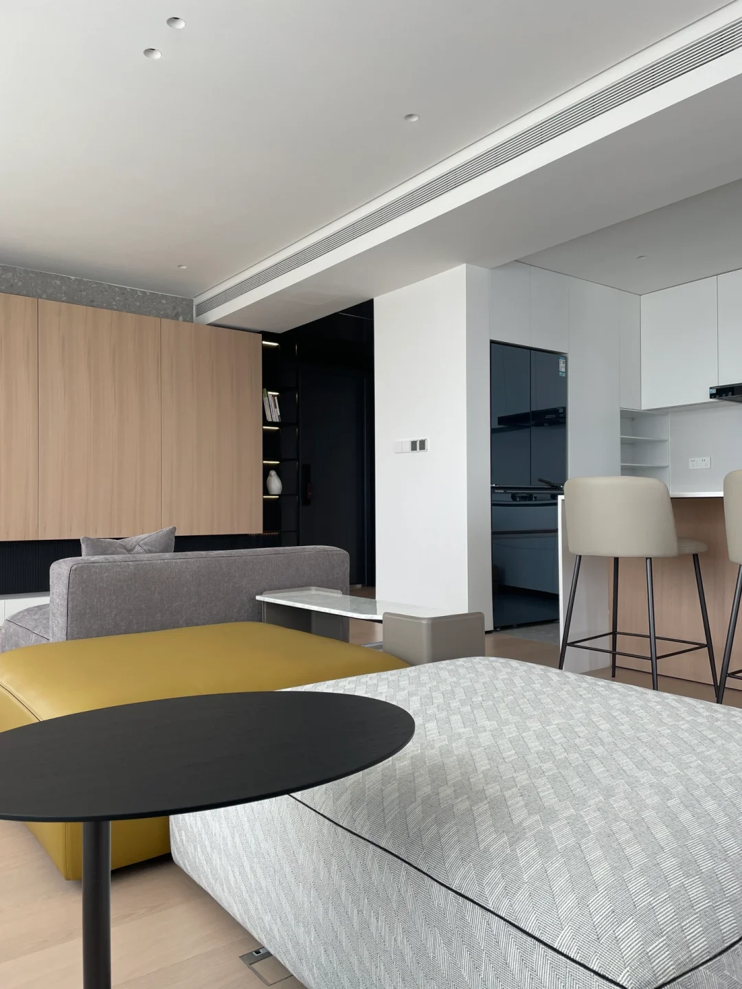 ⚫️本案中的客厅不是单纯的模块化布局,而是借用沙发分隔出了三个不同的空间:榻榻米娱乐区、吧台小酌区、沙发轻松区。不同的区域划分出了不同的生活方式,不仅仅是一个人的客厅,也是一个家庭的活动场所。生活的色彩并不是单一的,家庭中的每个人都可以在喜欢的区域活动,分区让客厅成为家庭情感的交汇空间。
