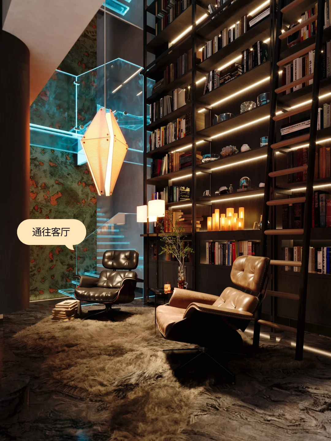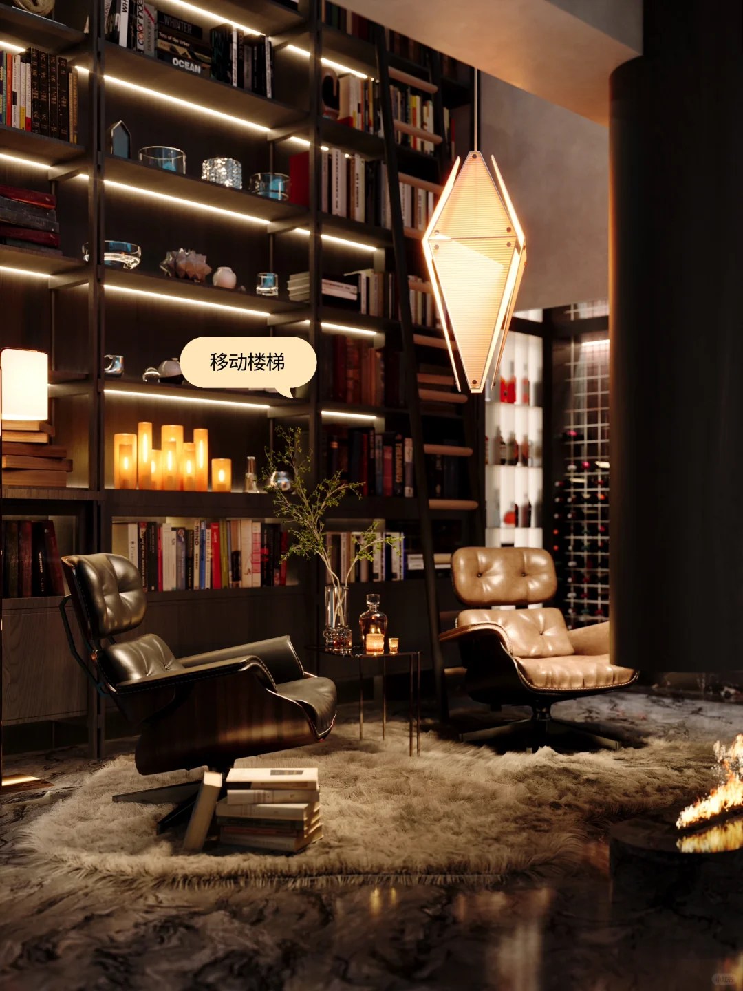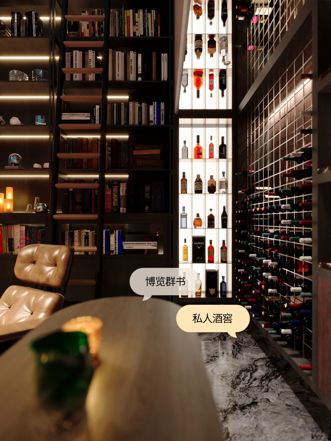 NEWCASE. 温州江心明月私宅 本案为四层别墅,挑高较高,地下空间可利用率高。业主喜好在家能有玩乐休息场所,我们在地下二层设计“博古书架”,与酒柜混合,不仅能煮酒品茗也能饱览群书。地下二层的地理位置确保了私密性质,空间充裕也能待客小憩。悬空层设计了可滑动的楼梯,用来取放高层的物品。点亮灯光,暗淡的地下室瞬间成为摩登风格的点睛之笔~