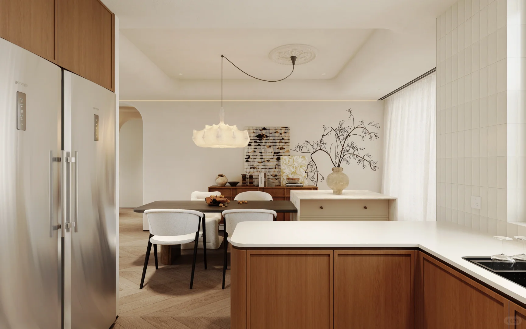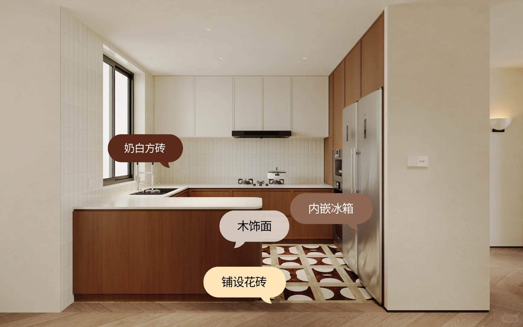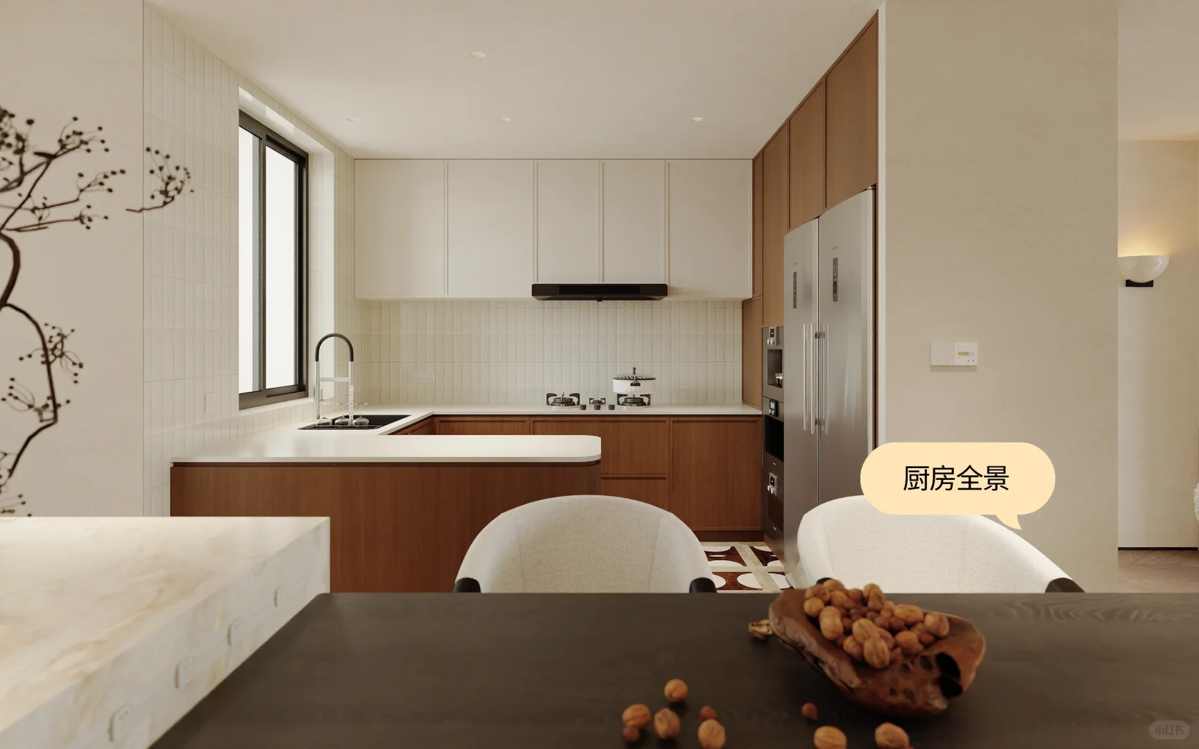 ADDRESS.温州保利天悦私宅 本案室内面积140m² ,属于充满活力的年轻主人。由于日常生活的起居习惯,开放式的自由厨房更便于使用。本案中厨房占地8.2 m² ,U形大面积台面满足一家三口日常生活操作方便!木饰面包裹厨房柜体,内嵌金属色利勃海尔冰箱。厨房选用白色岩板台面,上是奶油色吊柜,中间铺设奶白色小块格子砖,下面则选深色木饰面柜门。 美丽不一定要缤纷色彩,简约颜色也能轻松搭配时髦~
