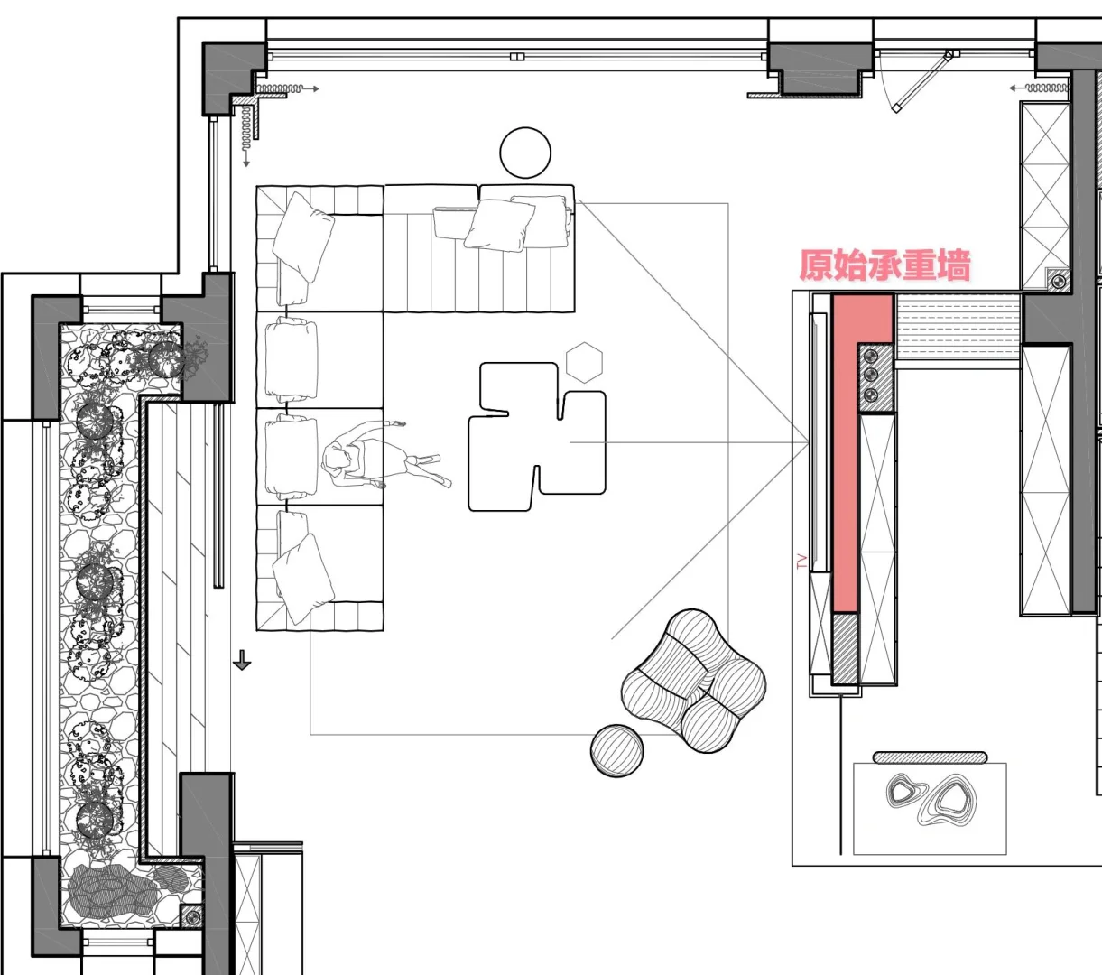 原来是设计师直接把电视墙做到打不掉的承重墙上,下面做镂空镜子模仿悬空的效果。设计师还说,这样就必不可能翻车了!来给大家解析下我们的做法吧: