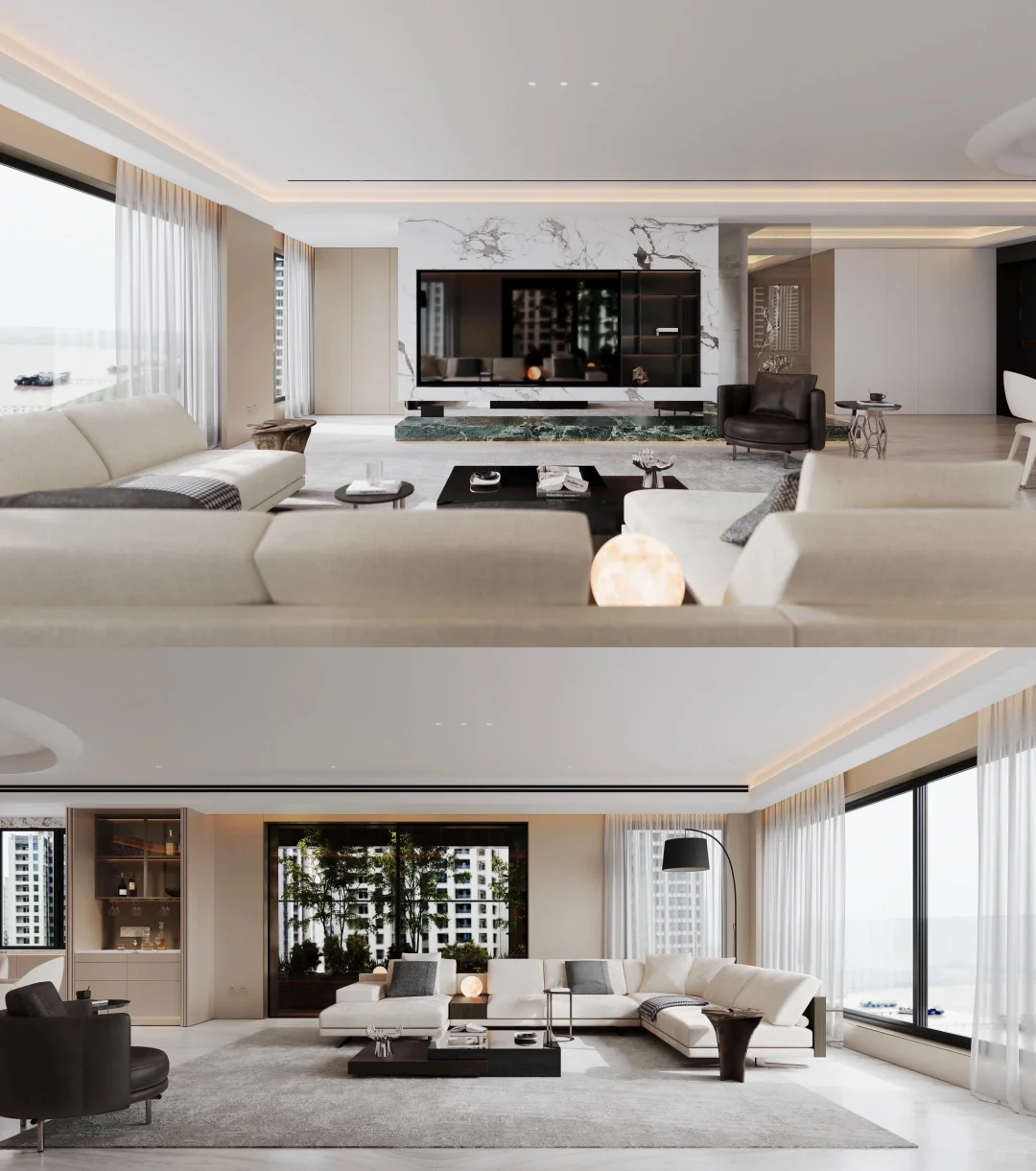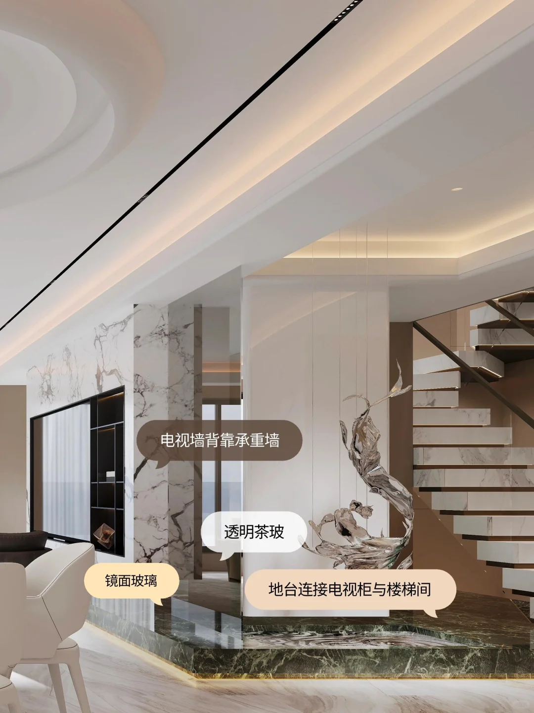 把大理石电视柜换成地台,同样能够放置物品但完全不会有下坠风险,美观简洁;大理石背景墙固定墙面焊死,背靠实心承重墙内部做木基础表面钉大理石;抬高部分做镜面造型,仿造悬空效果,同时能够保证安全稳固。