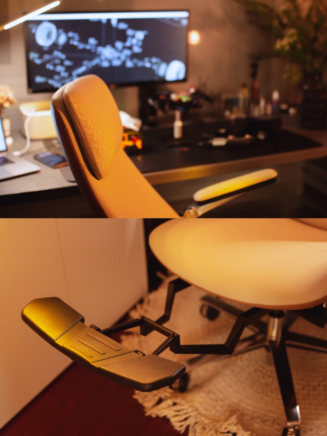 工作累了还可以调至后仰135度,再配上延伸出来的脚踏,