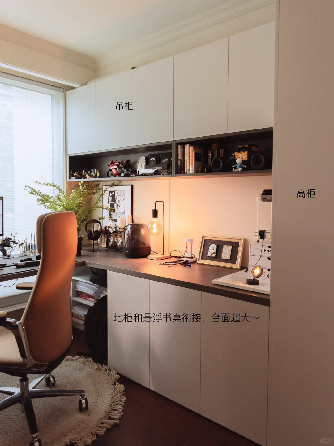 🖱️右侧边墙柜子:分为吊柜+高柜+地柜3部分,地柜和悬浮书桌衔接,形成L形桌面扩展工作空间。