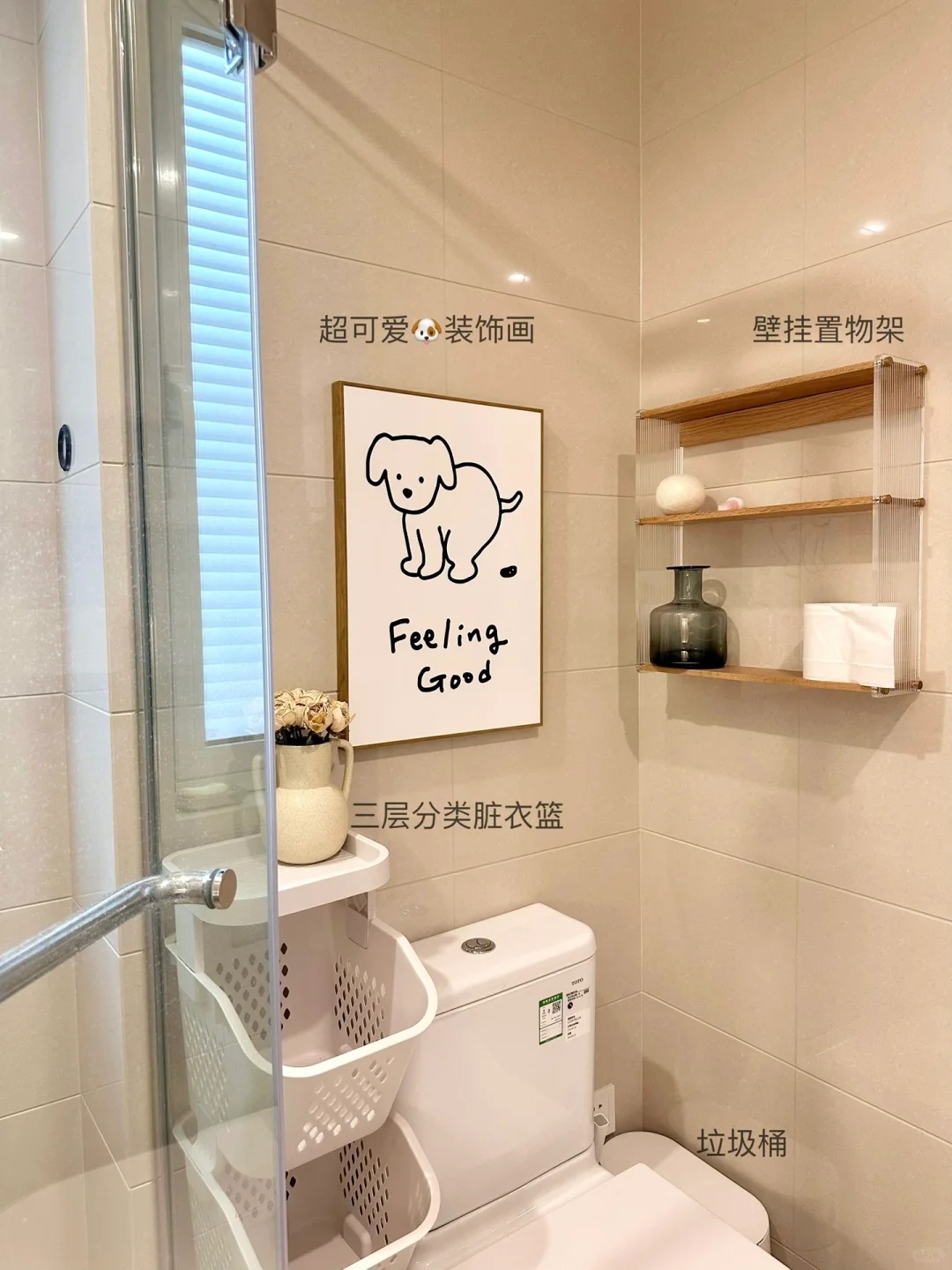 ▫️马桶区:进门右手边位置,我利用两侧窄缝分别放了分类脏衣篮和垃圾桶,墙面空间用置物架和装饰画作点缀。
