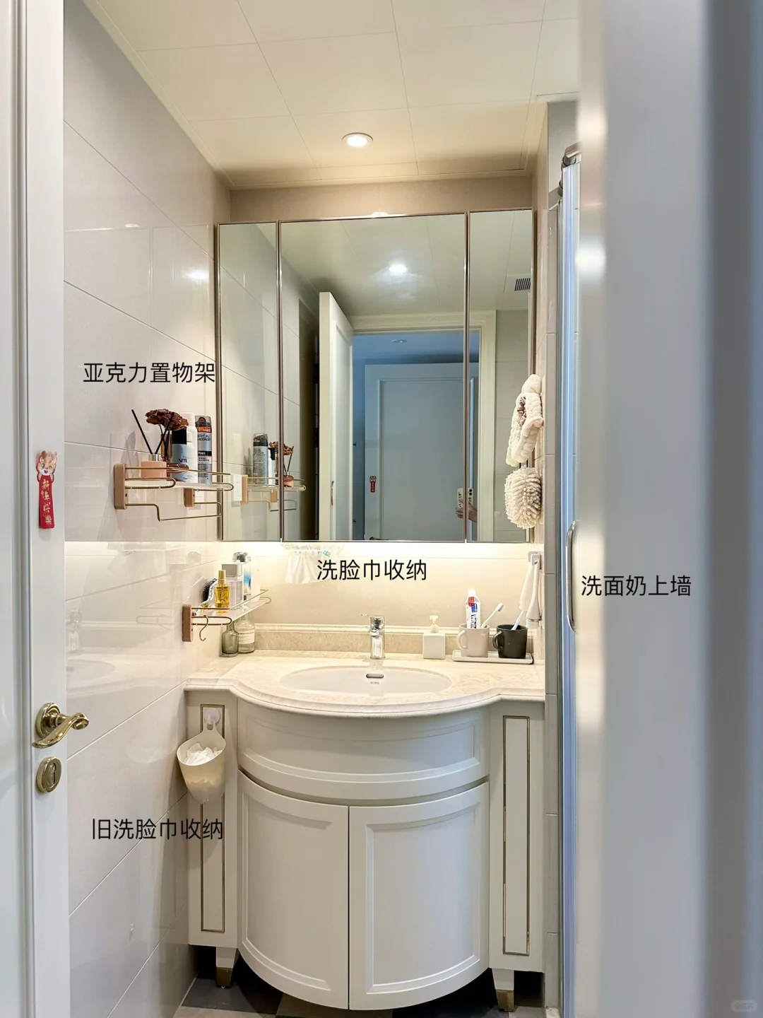 ▫️浴室柜:进门正对位置,有镜柜空间显大、底部弧形收纳柜,利用两侧墙壁空间用免钉胶上墙了2组亚克力置物架和一些挂钩等收纳零碎物品。