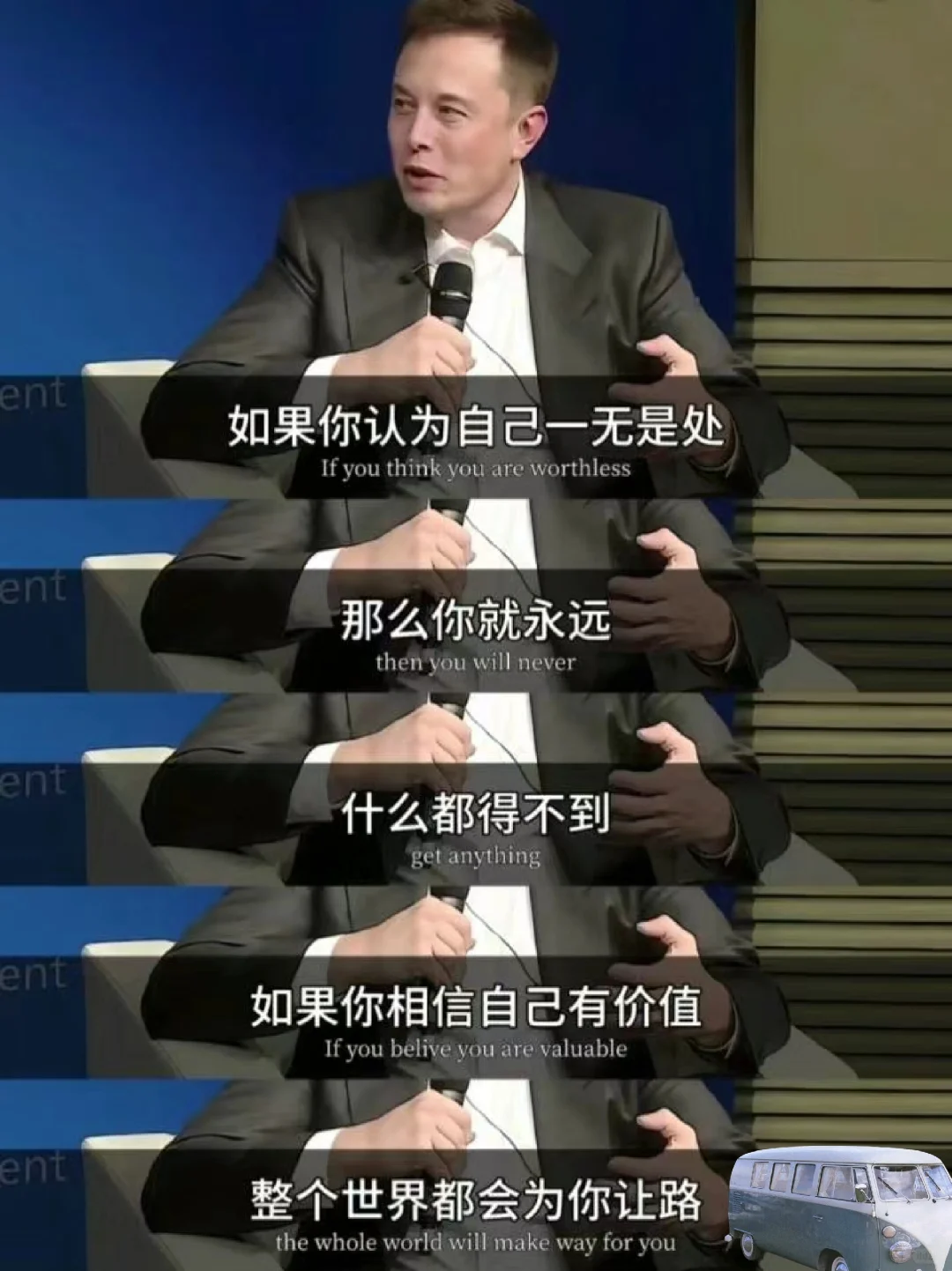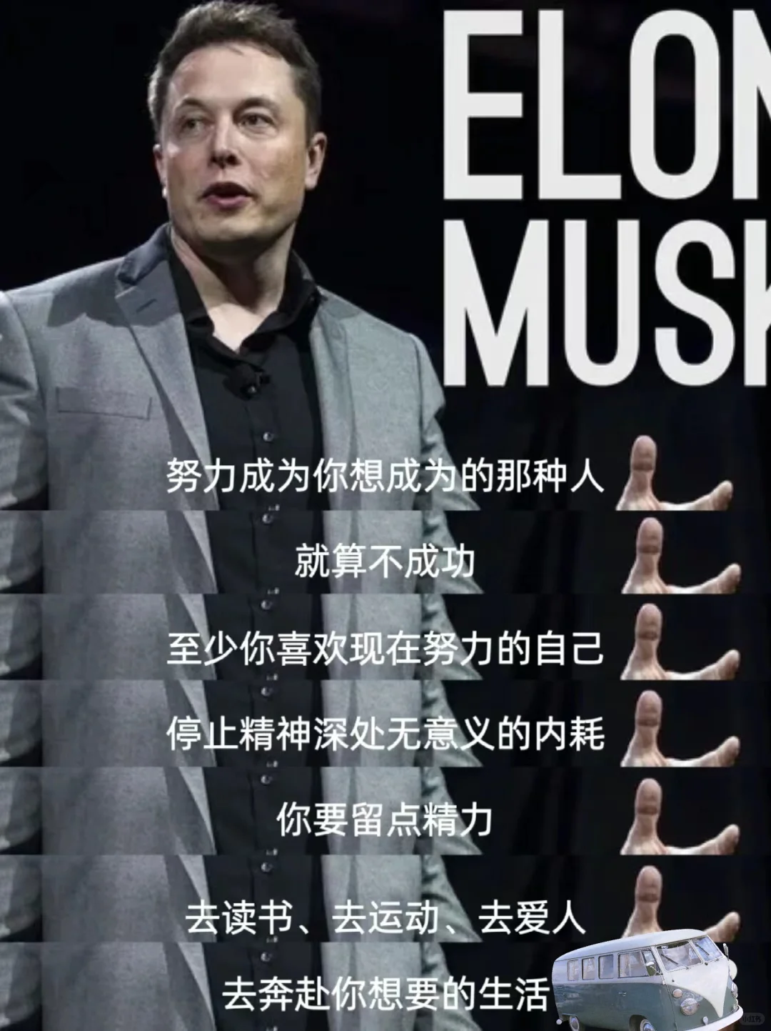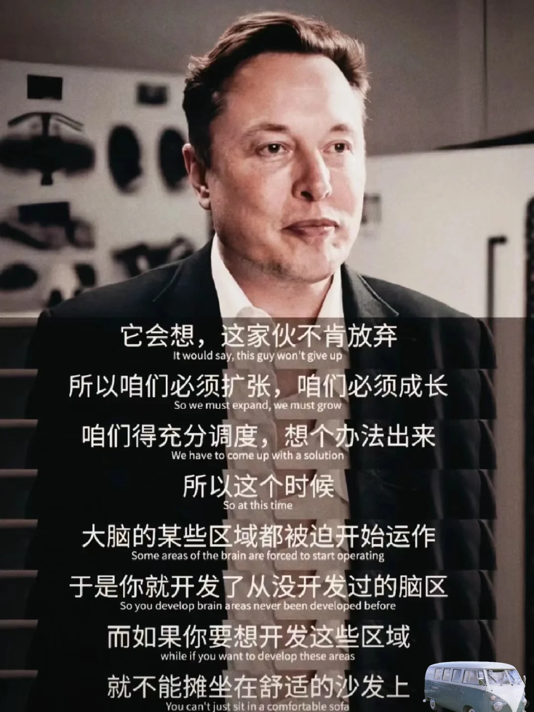 马斯克: 1、要充分开发大脑,你就不能瘫坐在沙发上。 2、停止内耗,去读书,去运动,去爱人,去奔赴你想要的生活! 3、如果你相信自己有价值,整个世界都会给你让路。 🤗😇🤔 [种草R] 以下是马斯克在大学的演讲我也很喜欢,分享之: 我现在想大声告诉你的是 What I want to tell you loudly now is that 过去对人的影响固然重要 while the impact of the past is certainly important更重要的是你如何对待过去 what matters more is how you deal with the past我曾在南非遭受霸凌和严重家暴 I suffered bullying and severe domestic violence in South Africa 那些记忆直到现在都会在我梦魇里 and those memories still haunt me in my nightmares until now 我也曾一度抗拒、厌恶过去的自己 I also once resisted and hated my past self. 只有你认识到过去是无法改变的 only by realizing that the past cannot be changed只有你接受过去的自己和既定的现实 and by accepting your past self and the established reality 才是你获得改变和新生的先决条件 can you obtain the prerequisite for change and renewal 你选择把你的余生花在什么事物上 You choose to spend the rest of your life on something 无论你是否愿意,这是你做的选择 whether you like it or not, it's your choice 你的时间在哪,你的生命就在哪里 Where your time is, there your life is‍ [种草R][种草R][种草R] [萌萌哒R]欢迎关注,这里会: [一R]日更闪光金句/经典书摘 [二R]来这世间一趟,要看看太阳呀 [三R]适度思考,链接现实,好好开干!