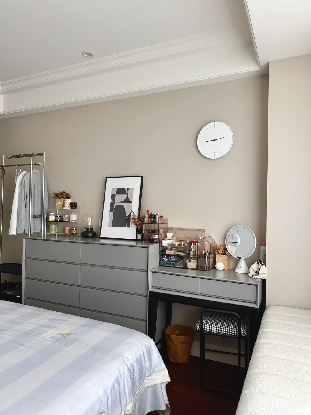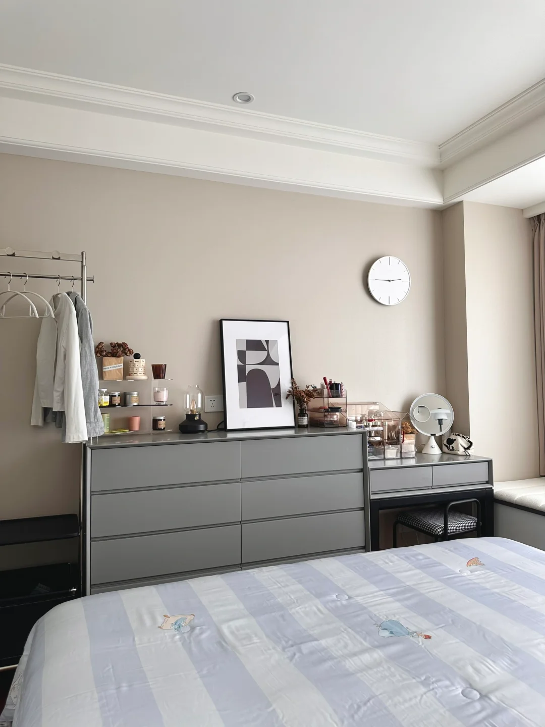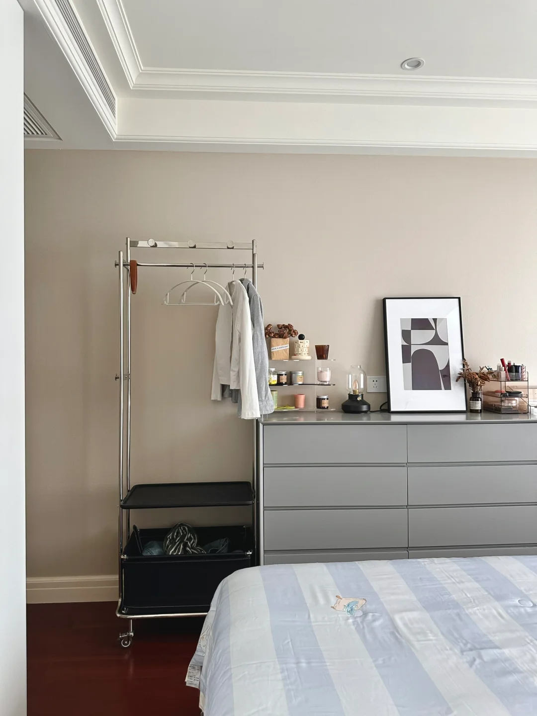 ☑️床尾90厘米的过道安排八斗柜+隔夜衣架+梳妆台的组合