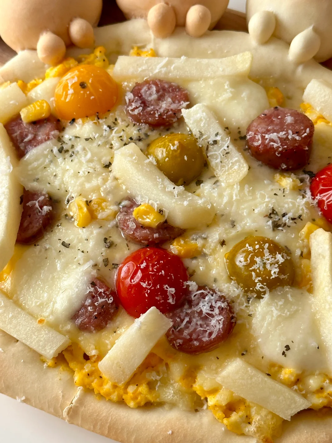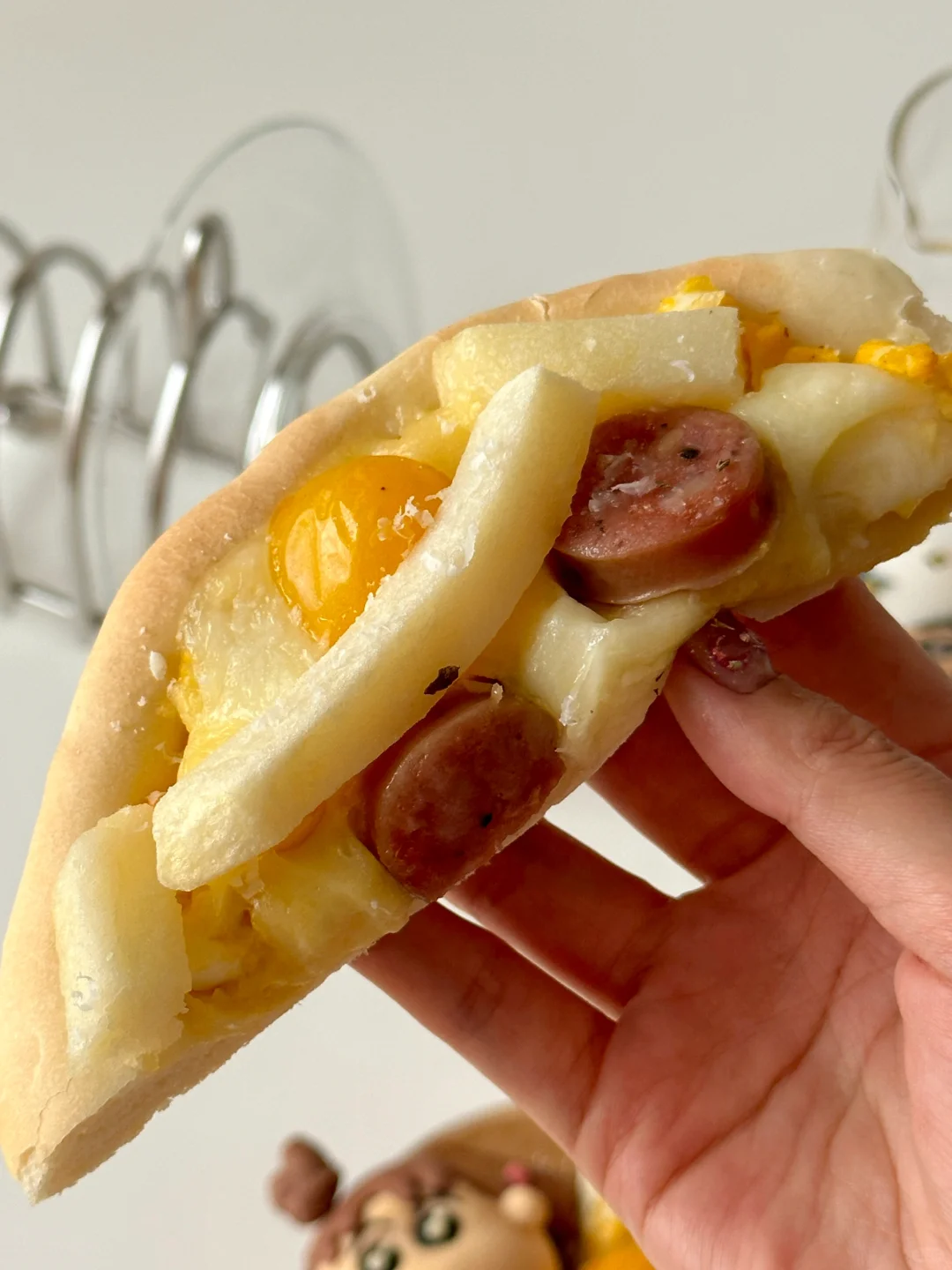 ⑥披萨饼底用叉子插孔,铺上鸡蛋沙拉,马苏里拉芝士碎,香肠,薯条等自己喜欢的食材