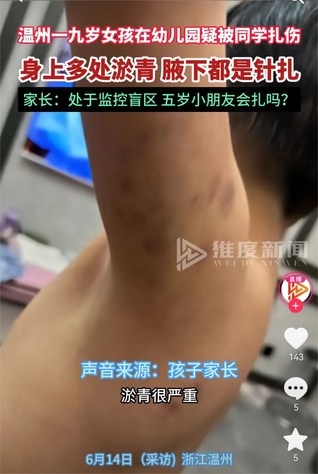 而且孩子被扎基本都是在腋下周围,试问那个小朋友能做到如此精准?