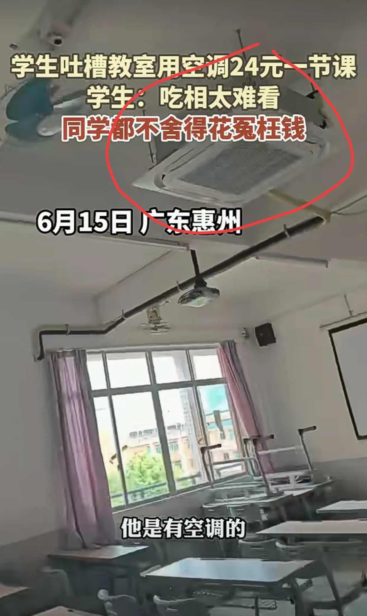 “24 元一节课的空调”——广东惠州这所学校空调费引关注 近日在广东惠州,某学校教室空调使用情况引发热议!学生爆料称,在教室使用空调竟然要 24 元一节课,这让学生们直呼“吃相太难看”,很多同学都表示舍不得花这“冤枉钱”。 该校教室装的是中央空调,使用规则也较为复杂。需微信扫码预付费才能开启电表用电,结束用电得重新扫码点击“结束使用”来结算退费。预付电费用完就会强制断电,再次付款启用要等 3 到 5 分钟。还特别强调要多预付以免上课期间断电后无法及时续电,结束空调用电得先关空调再点击手机操作。 样的规定和收费实在让人有些难以接受,不仅费用高,流程还繁琐。这到底合不合理呢?大家对此怎么看?