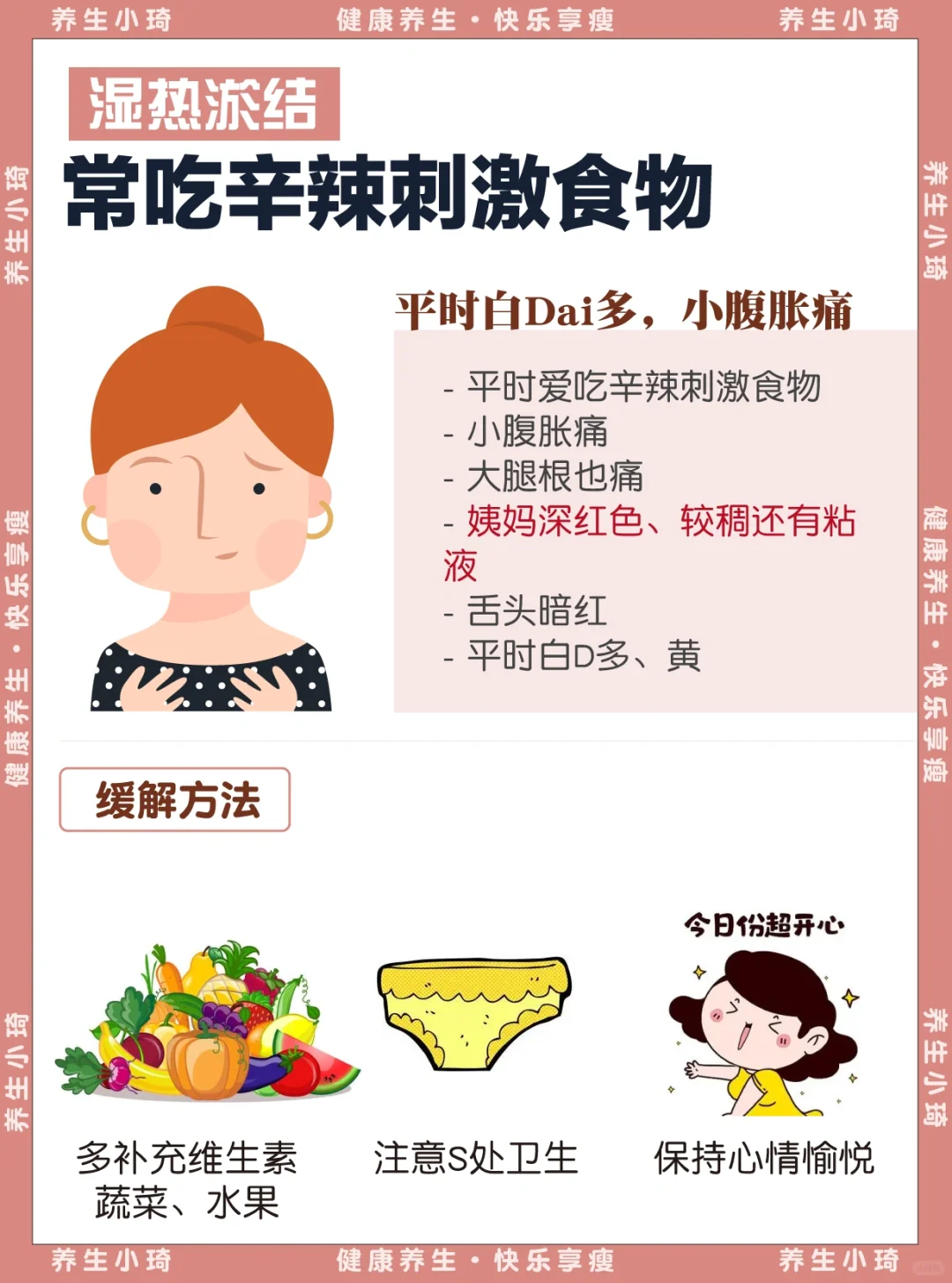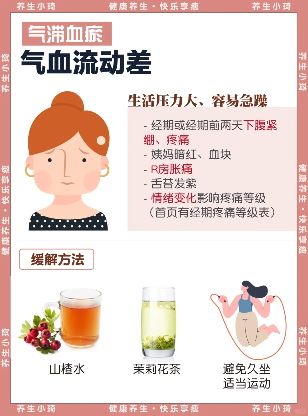 [失望R]据说每10个小仙女中就有8个有痛经,有些小仙女甚至都已经影响到生活和工作了,尝试了很多方法,可还是没有什么改善[失望R] [清单R]原来痛经有4种类型,对照调理才行! [火R]大猪蹄子也赶紧收藏一下,不要女朋友说痛经就只叫她多!喝!热!水![火R] - 气滞血瘀型:生活压力大、容易急躁 寒湿凝滞型:脸色苍白、手脚冰凉 气血亏虚型:过度疲劳、营养不足、无精打采 湿热瘀结型:常吃辛辣刺激食物,带带多