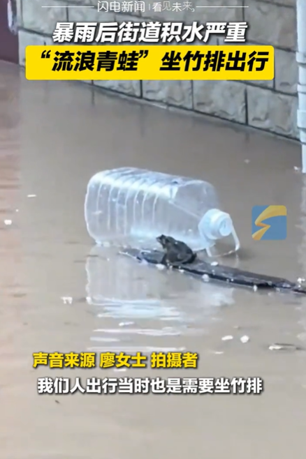 笑不活了!由于桂林发生了洪水,一名男子被困在家中,突然,他在阳台上看到洪水中有个黑乎乎的东西,起初以为是鱼,结果,仔细一看才发现是只青蛙,趴在竹排上随波逐流,开始了漂流生活。它游了一辈子的泳,没想到有一天自己还需要竹板搭救,这一幕真是既搞笑,又奇葩。这只青蛙真是把“蛙脸”都丢尽了。 印象中,青蛙都是游泳健将,要不然也不会有蛙泳一说。可这只青蛙为什么那么奇怪,难道是怕被淹死吗? 特地查了下,青蛙还真有被淹死的可能。因为它们游泳虽然厉害,但也抵不住一直游啊,它们必须定期出水换气,否则也是会有溺水、淹死的风险。 这只青蛙也算是聪明,它还知道跳到竹板上漂流,看来基本的生存技能还是没问题。不过,它这一直漂下去,它的蛙生就难说了,毕竟前面还看到水里有蛇的事件。 一场洪水,会游泳的不会游泳的都沉默了。这不知道让多少动物逃难了,连青蛙都未能幸免,真是来得快,来得猛! 不过,这也给大家提了个醒,涨洪水的时候,不管水深还是水浅,水里还是不要多呆了,尽管要坐竹筏出行,也要注意安全!那么多小动物都在水里,搞不好还得来个近距离接触?