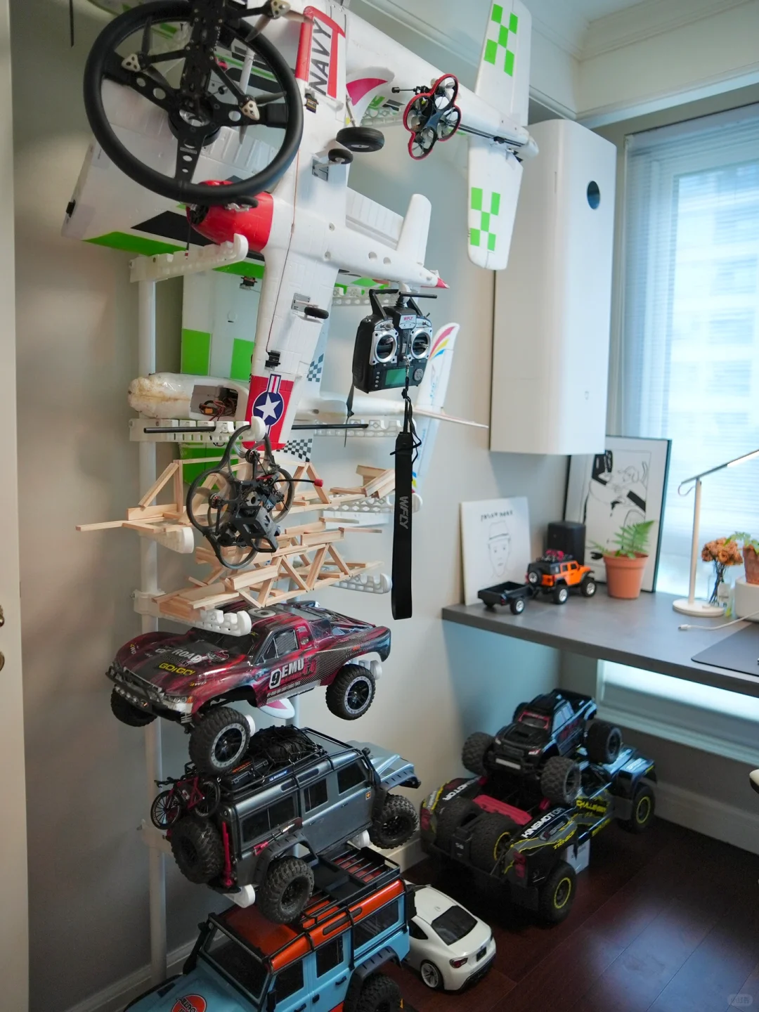 🖱️左侧空白墙:顶天立地收纳架是老公的模型玩具收纳展示空间。