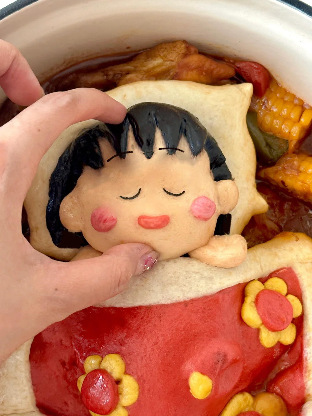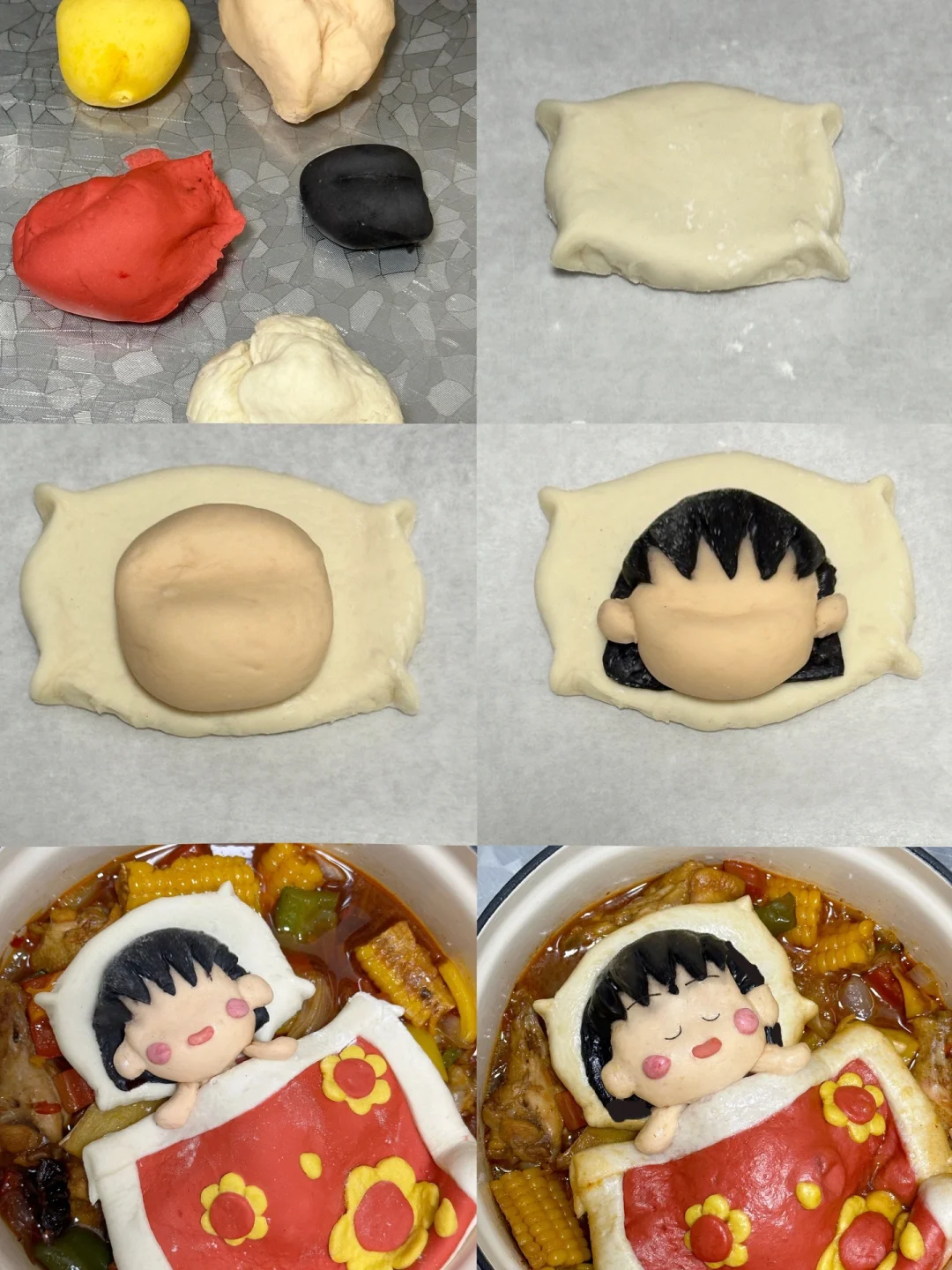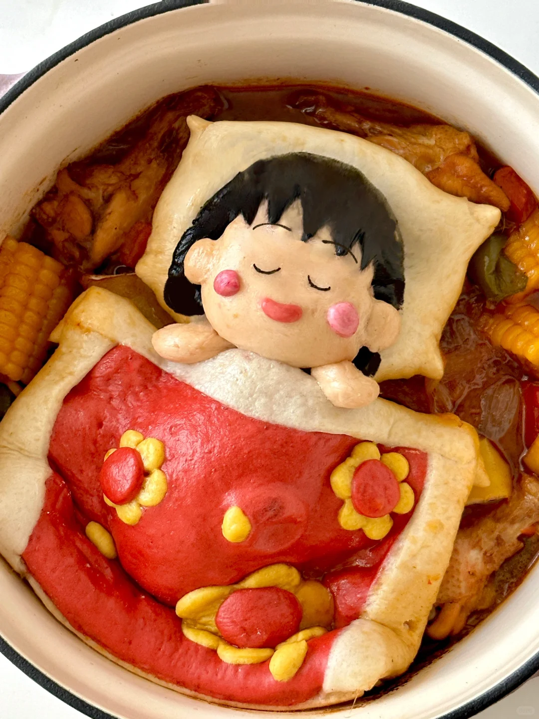 ⑥锅中下入彩椒,洋葱,将小丸子放在锅中盖上被子,中火焖煮15分钟便可出锅啦,出锅用可食用色素笔画上小丸子的眼睛眉毛