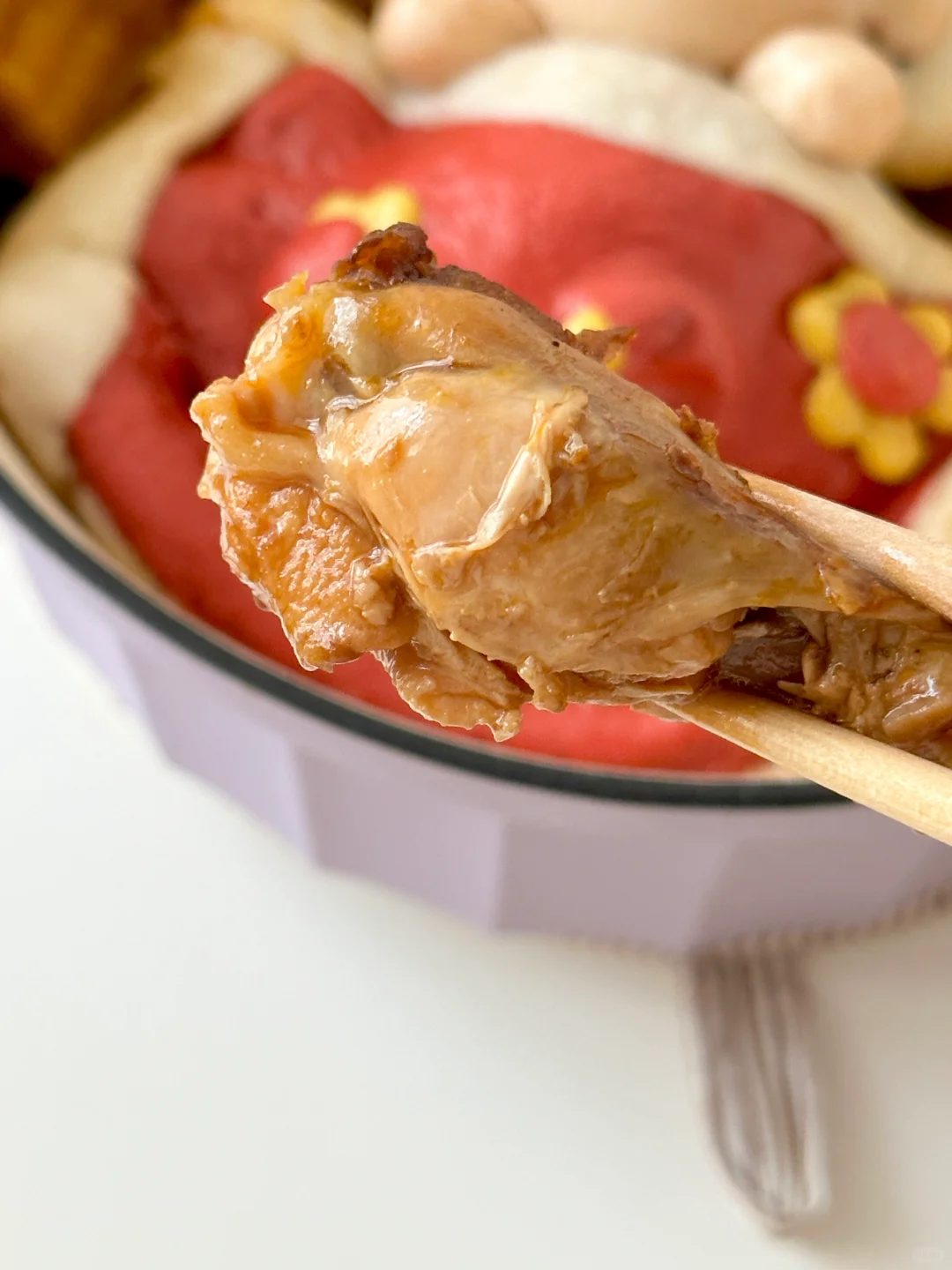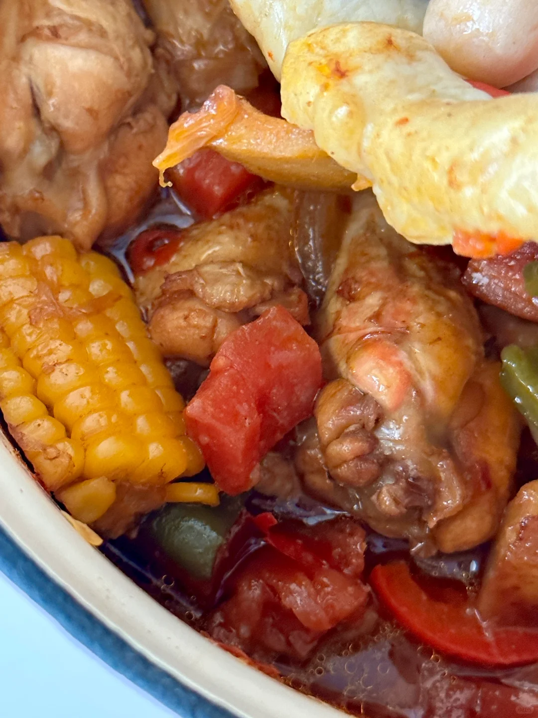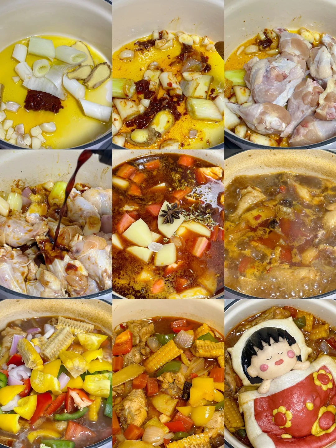 葱段,姜片,大蒜,洋葱,郫县豆瓣酱,胡萝卜,土豆,彩椒,玉米,小鸡腿,八角两颗,花椒粉,十三香