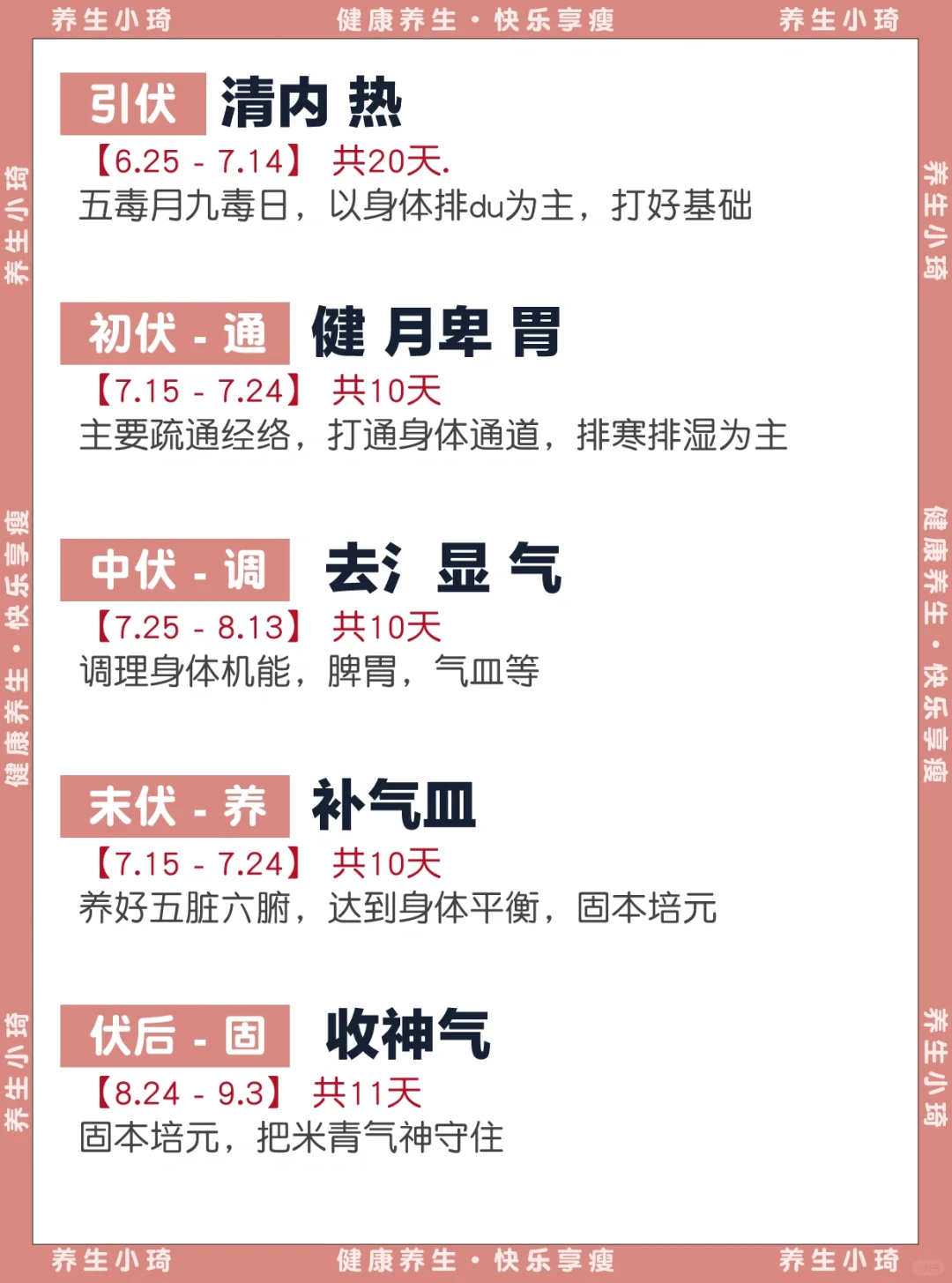 2024年雨水很多,但是也意味着今年阳气足 中式养身认为“冬🧊夏治”,是健月卑、去氵显、补气皿的好时间段 - [清单R]2024三伏天要来了,调理身体的黄金期要抓紧 引伏 - 〖清内热〗:6.25 - 7.14,共20天 初伏 - 〖健月卑胃〗:7.15 - 7.24,共10天 中伏 - 〖去氵显气〗:7.25 - 8.13,共20天 末伏 - 〖补气皿〗:8.14 - 8.23,共10天 伏后 - 〖收神气〗:8.24 - 9.3,共11天