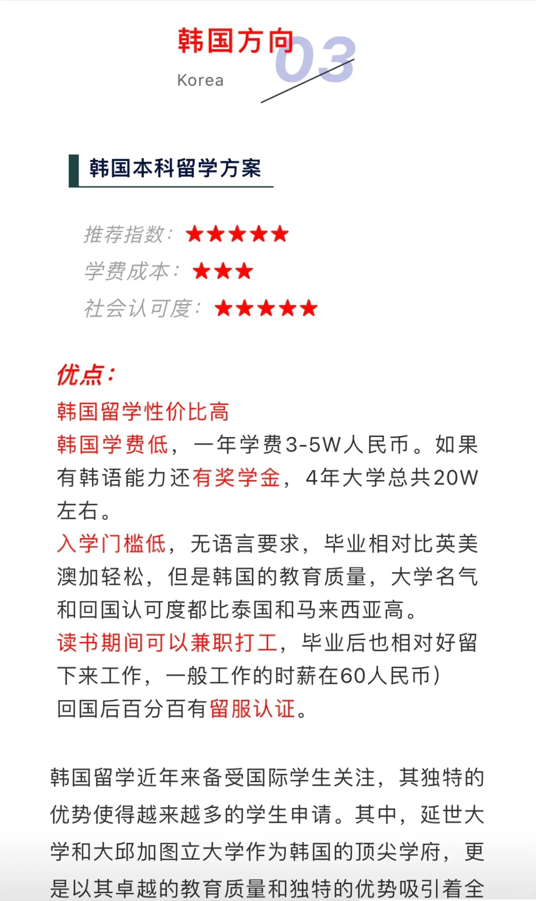 入学门槛低,无语言要求,毕业相对比英美澳加轻松,但是韩国的教育质量,大学名气和回国认可度都比泰国和马来西亚高。读书期间可以兼职打工,毕业后也相对好留下来工作,一般工作的时薪在60人民币)回国后百分百有留服认证。