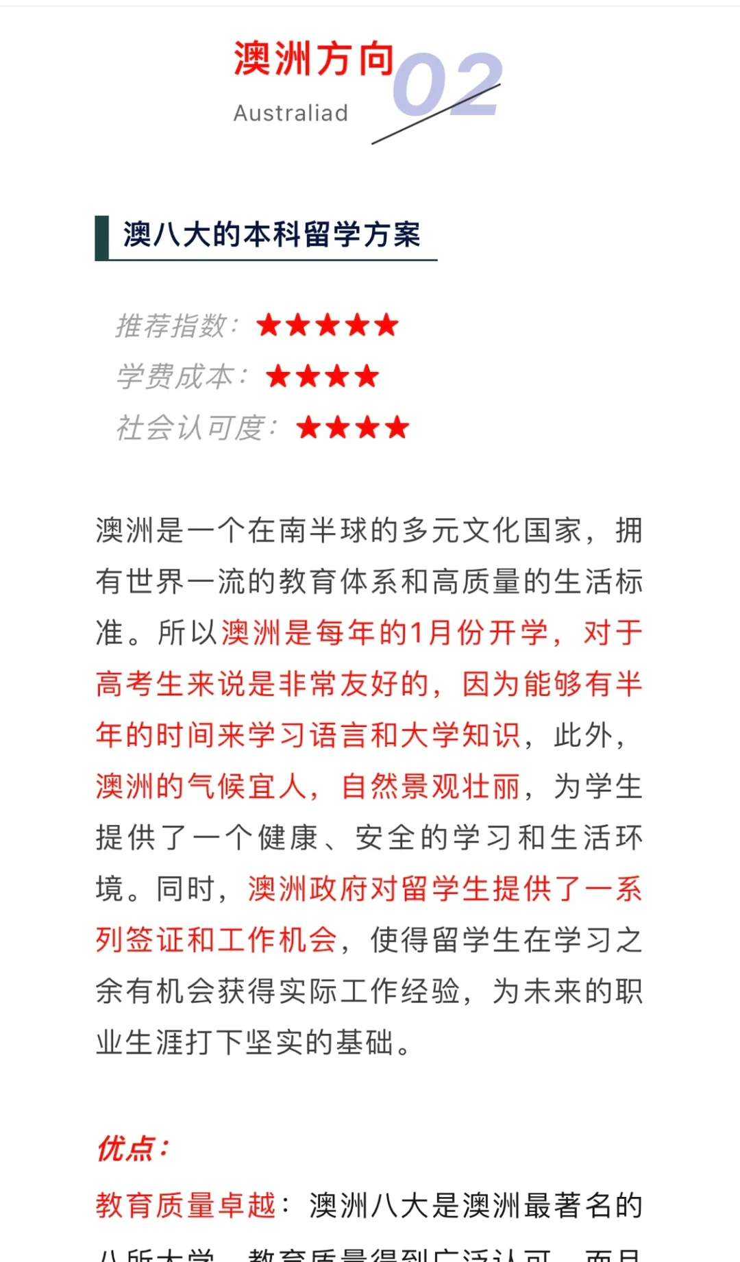 教育质量卓越:澳洲八大是澳洲最著名的八所大学,教育质量得到广泛认可,而且院校基本上认可高考成绩。