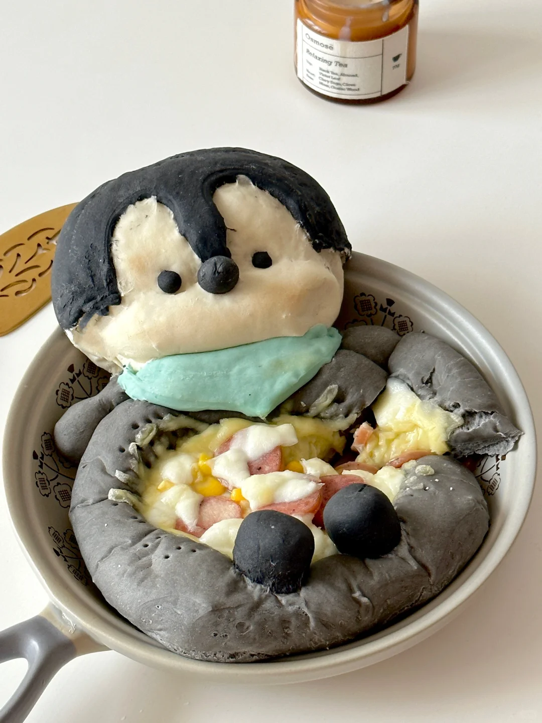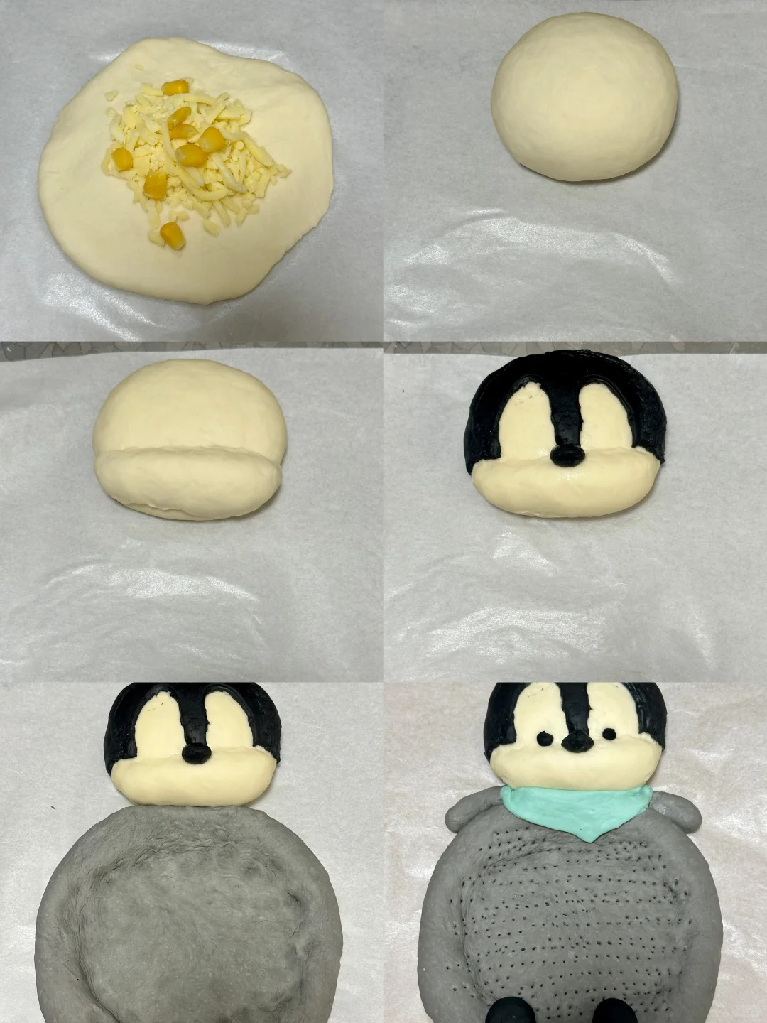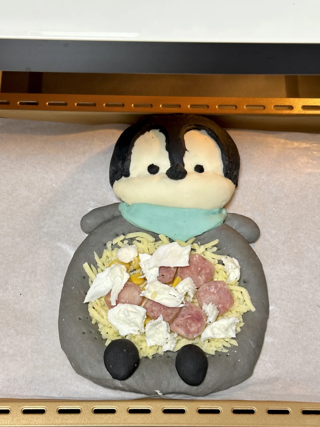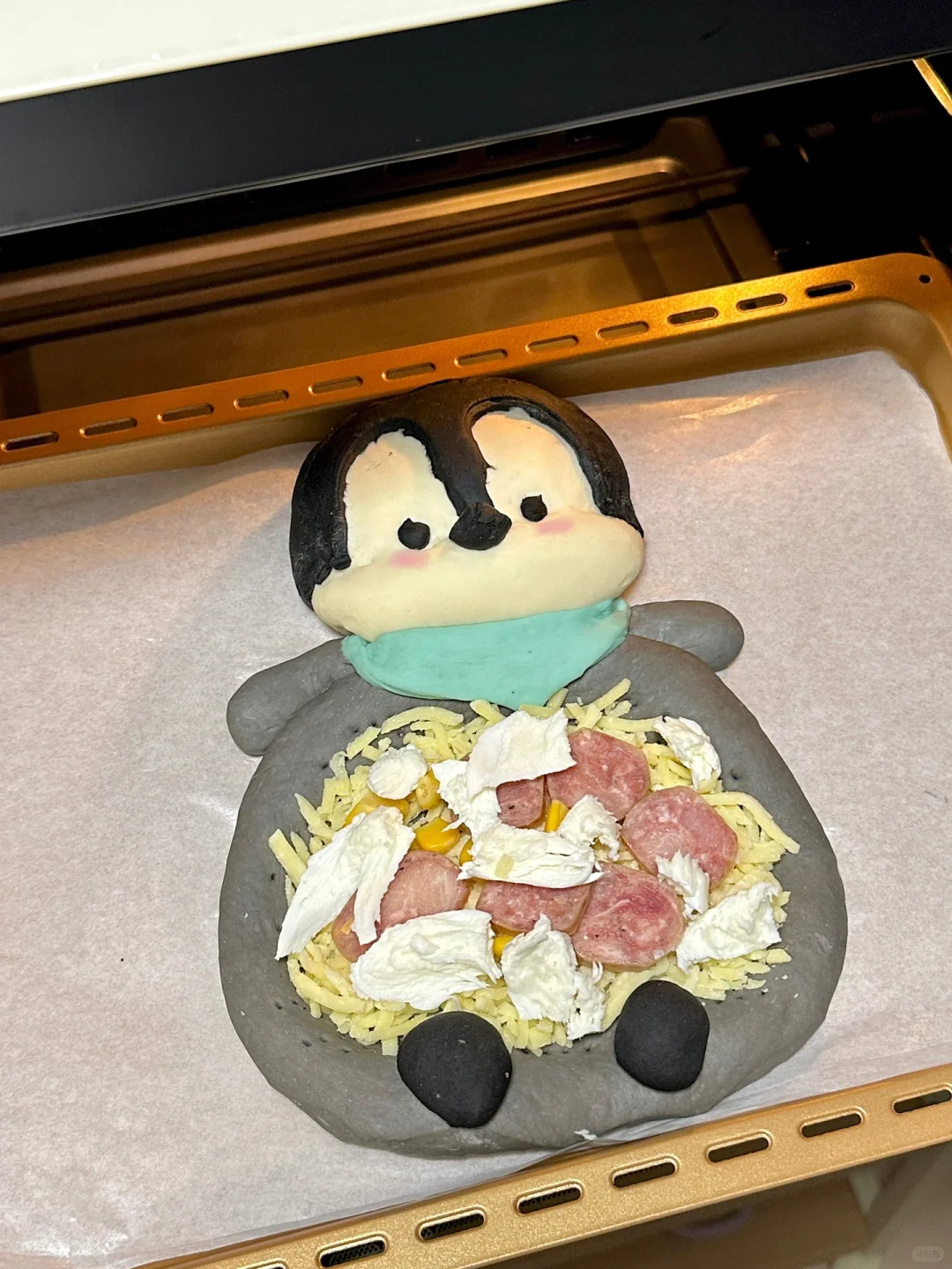 脑袋里也是满满的馅料~ 所需材料: 高筋面粉 100g,低筋面粉 150g,水140g,盐1g,白砂糖15g,橄榄油10g,酵母 3g 制作步骤: ①将披萨饼皮所需材料全部混合,揉匀 ②盖上保鲜膜发酵一个小时左右至两bei大 ③面团排气揉光滑 ④面团上色(黑色:竹炭粉 灰色:少量竹炭粉 蓝色:蓝色色素) ⑤头和身子的比例1:3,取小企鹅头所需的面团揉 匀擀平,包入芝士碎(玉米粒,土豆泥,火腿都 OK!),收口朝下,稍微压压平 ⑥按图示制作细节 ⑦饼底用叉子扎孔,铺上食材 ⑧烤箱预热 210°烘烤15分钟左右 (期间观察上色情况,及时加盖锡纸,防止上色过重) 快来交作业吧!