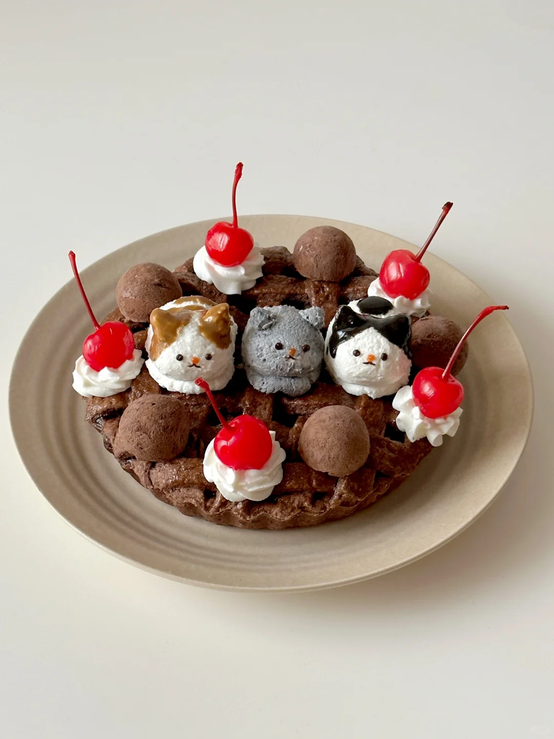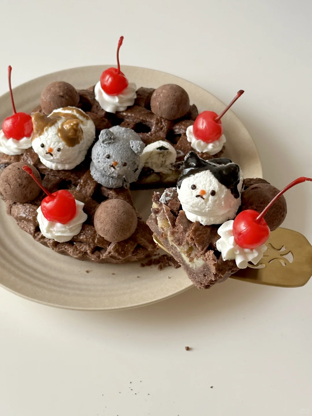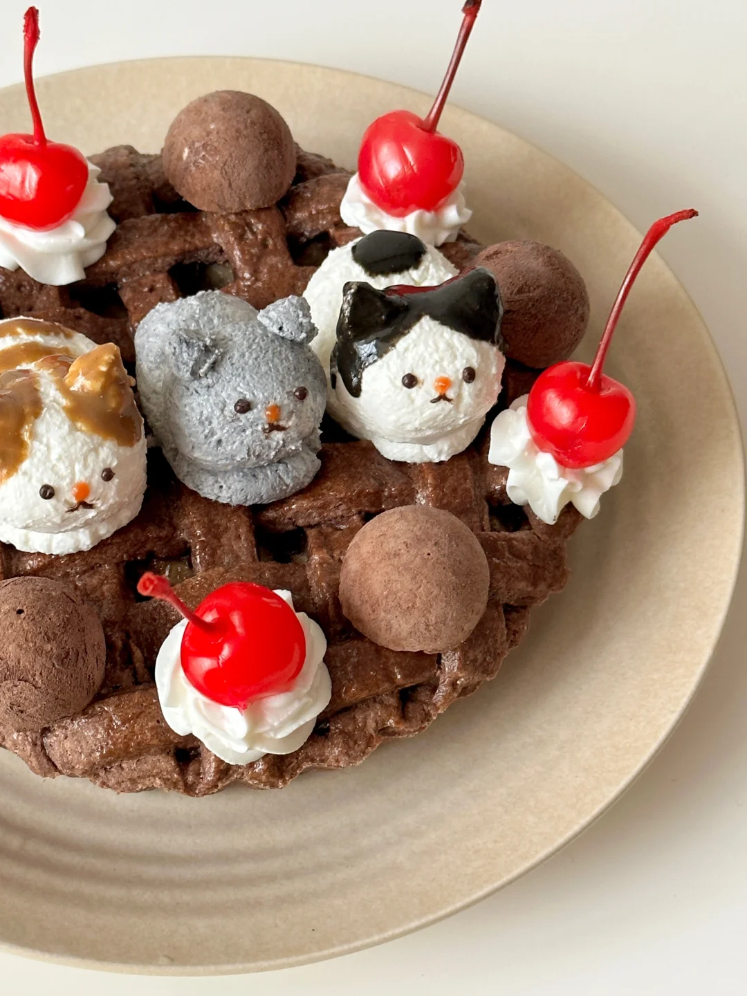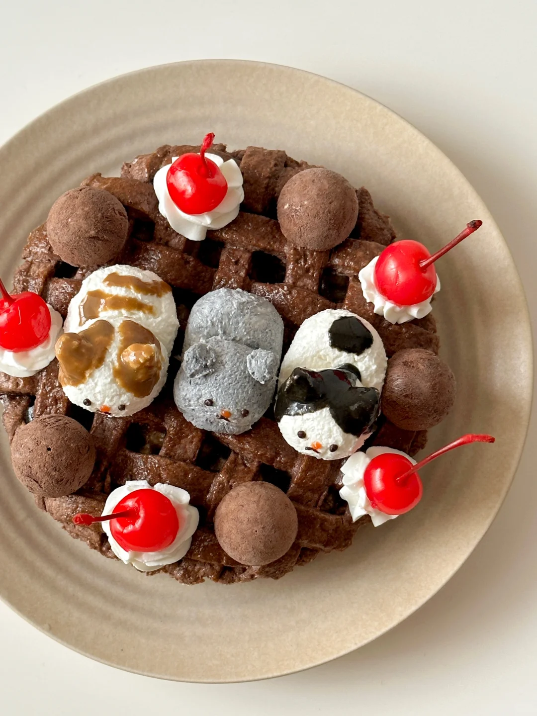 ⑥过滤好的希腊酸奶捏出猫咪,用黑芝麻酱和白芝麻酱上色