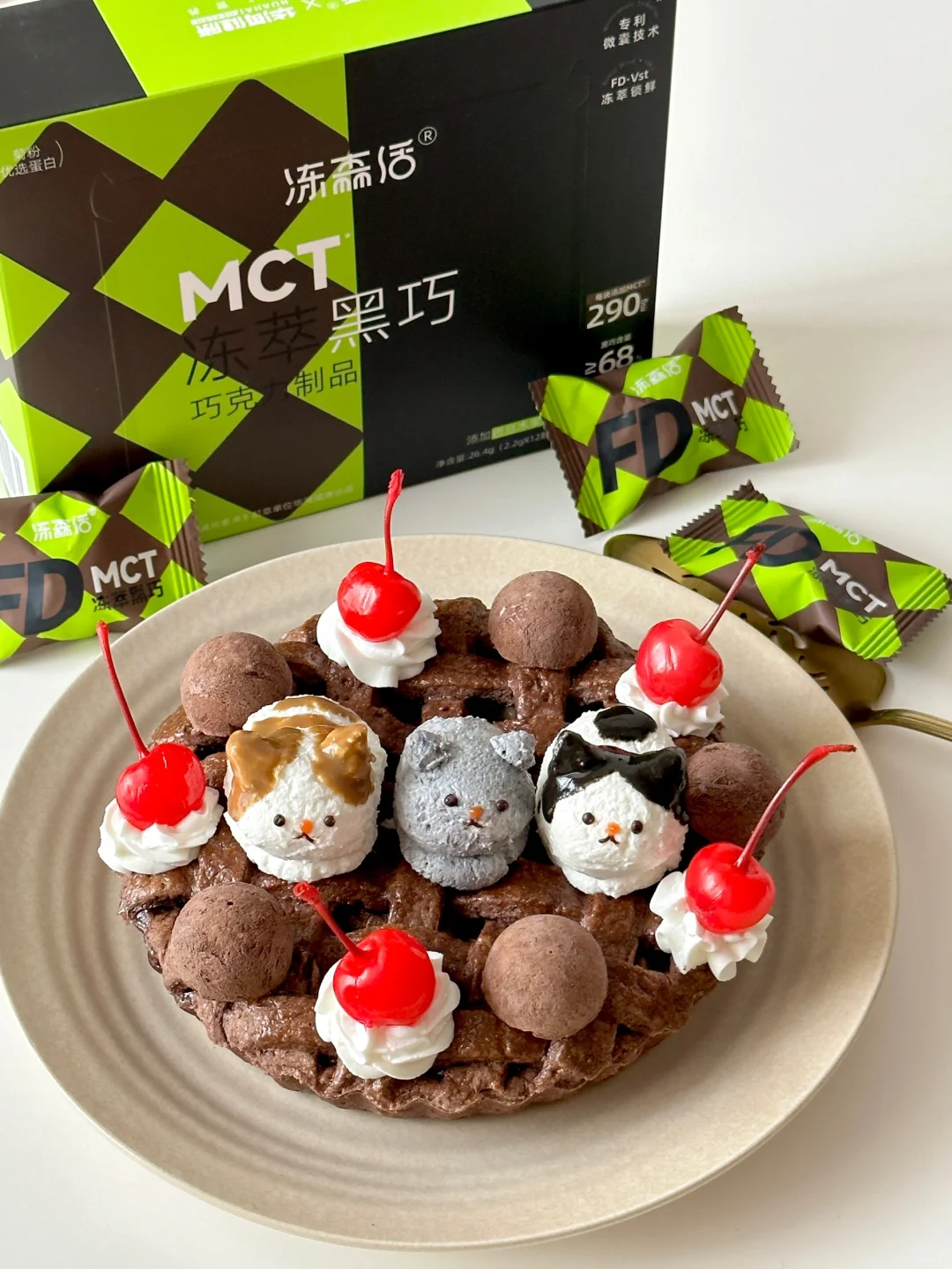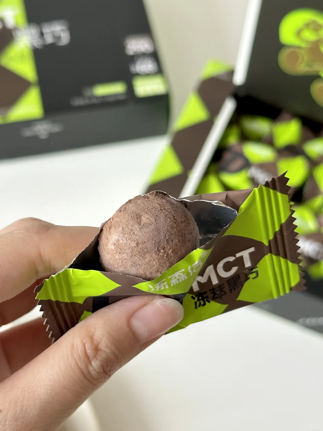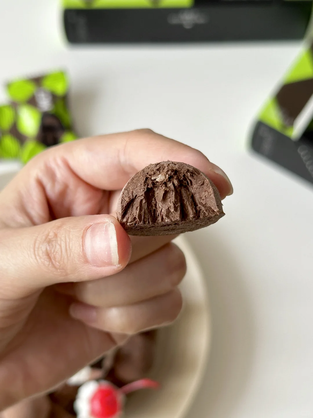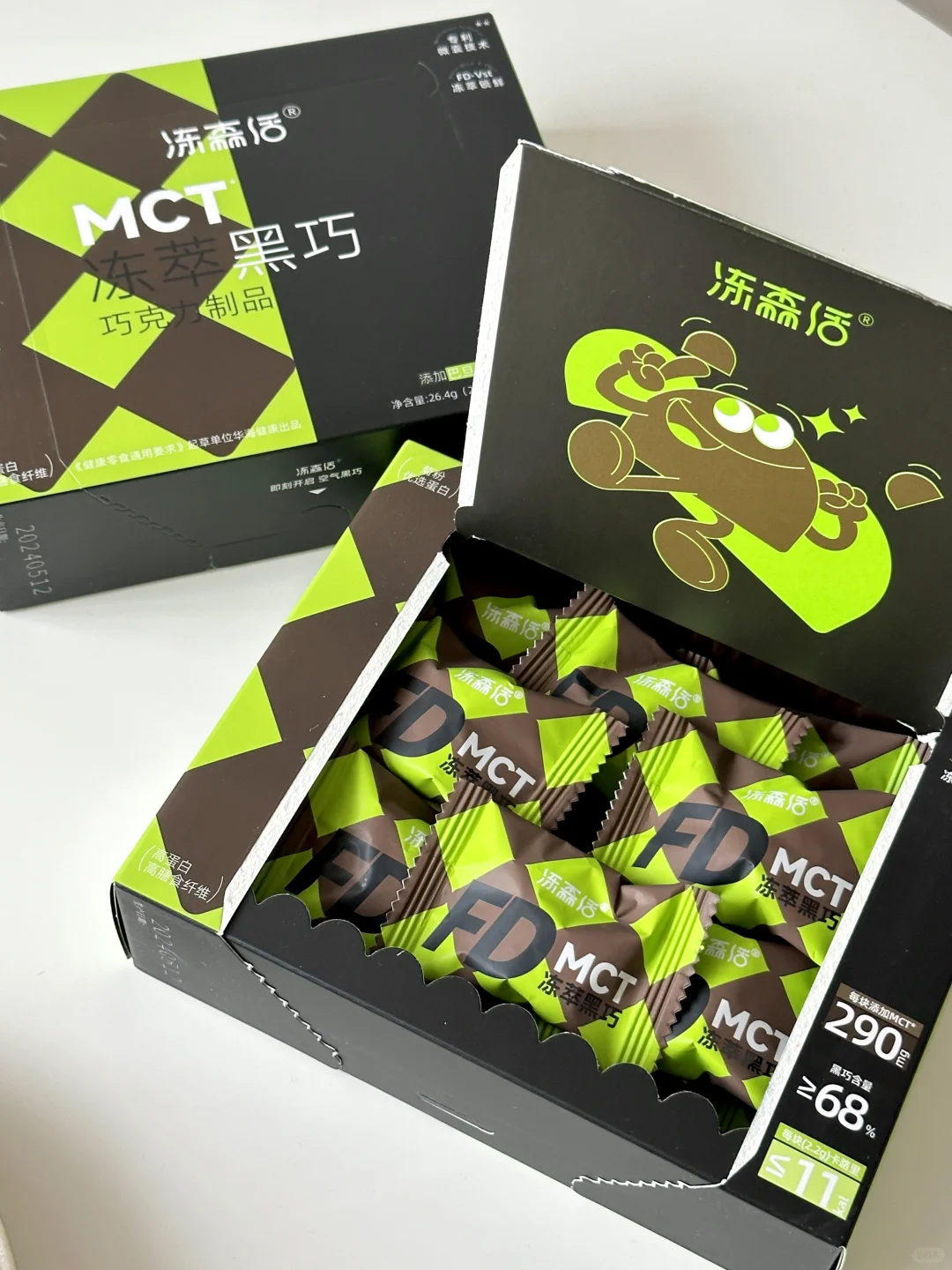 [害羞R]黑巧用的是冻森活家的空气黑巧!口感真的超级特别,没有传统巧克力的甜腻感,一整个像云朵☁️一样蓬松!而且一颗才11大卡,里面还添加巴旦木丰富了口感,轻卡又美味,和今天可可派超级搭![色色R]