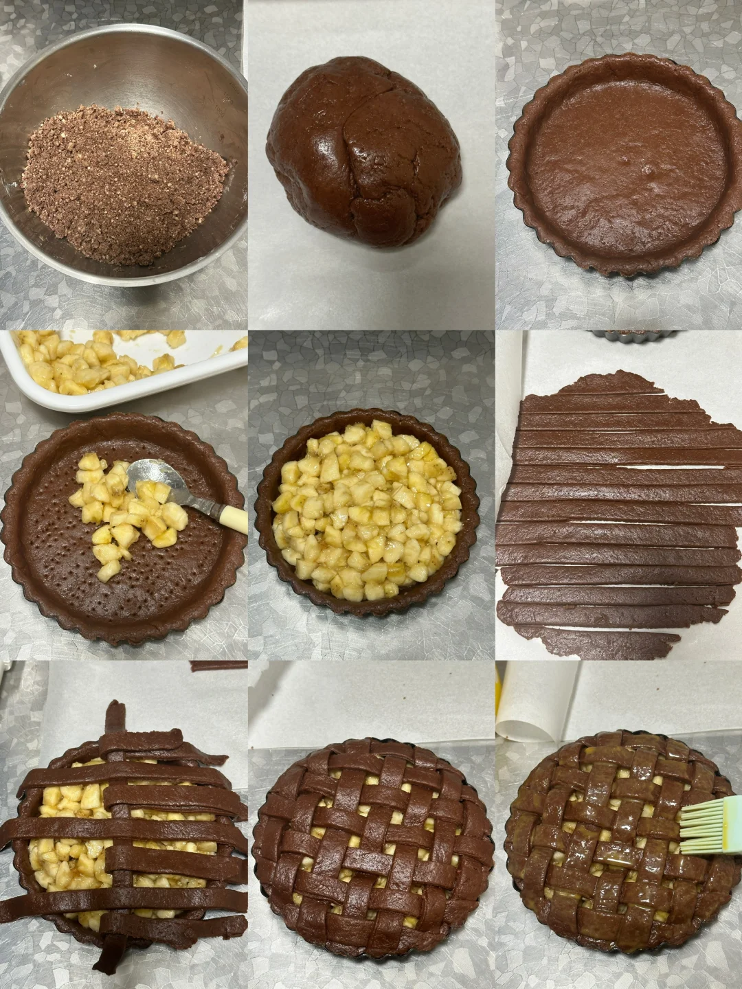 低筋面粉 180g,黄油80g,细砂10g,盐1g,全蛋液70g,可可粉9g,香蕉两个