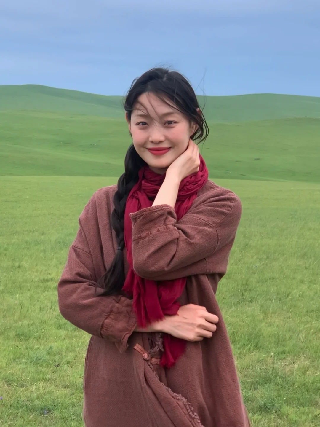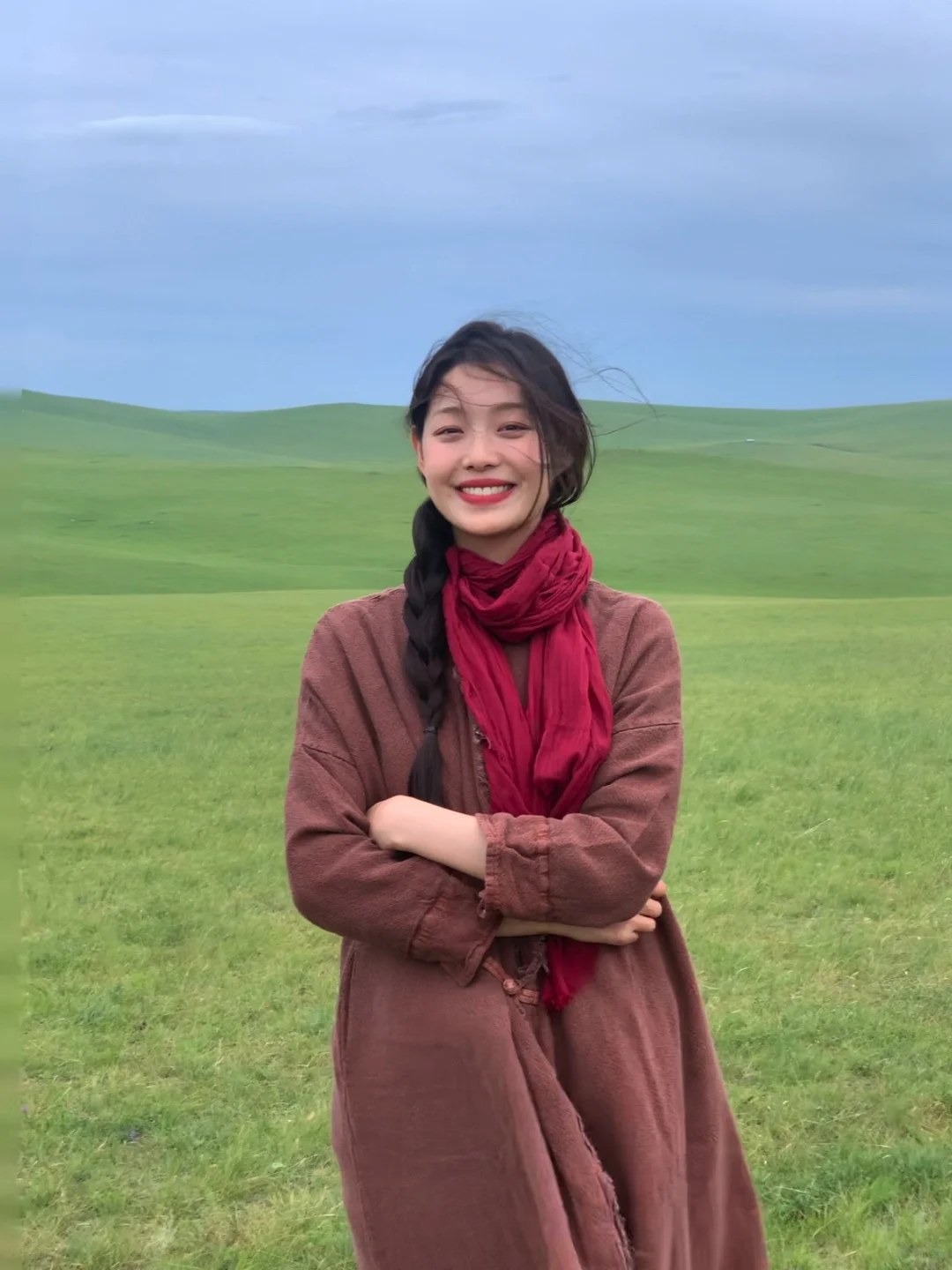 《红衫白裤的清序》正红上衣裹着舒展的妥帖,像把晴光揉进衣料里——领口轻落的