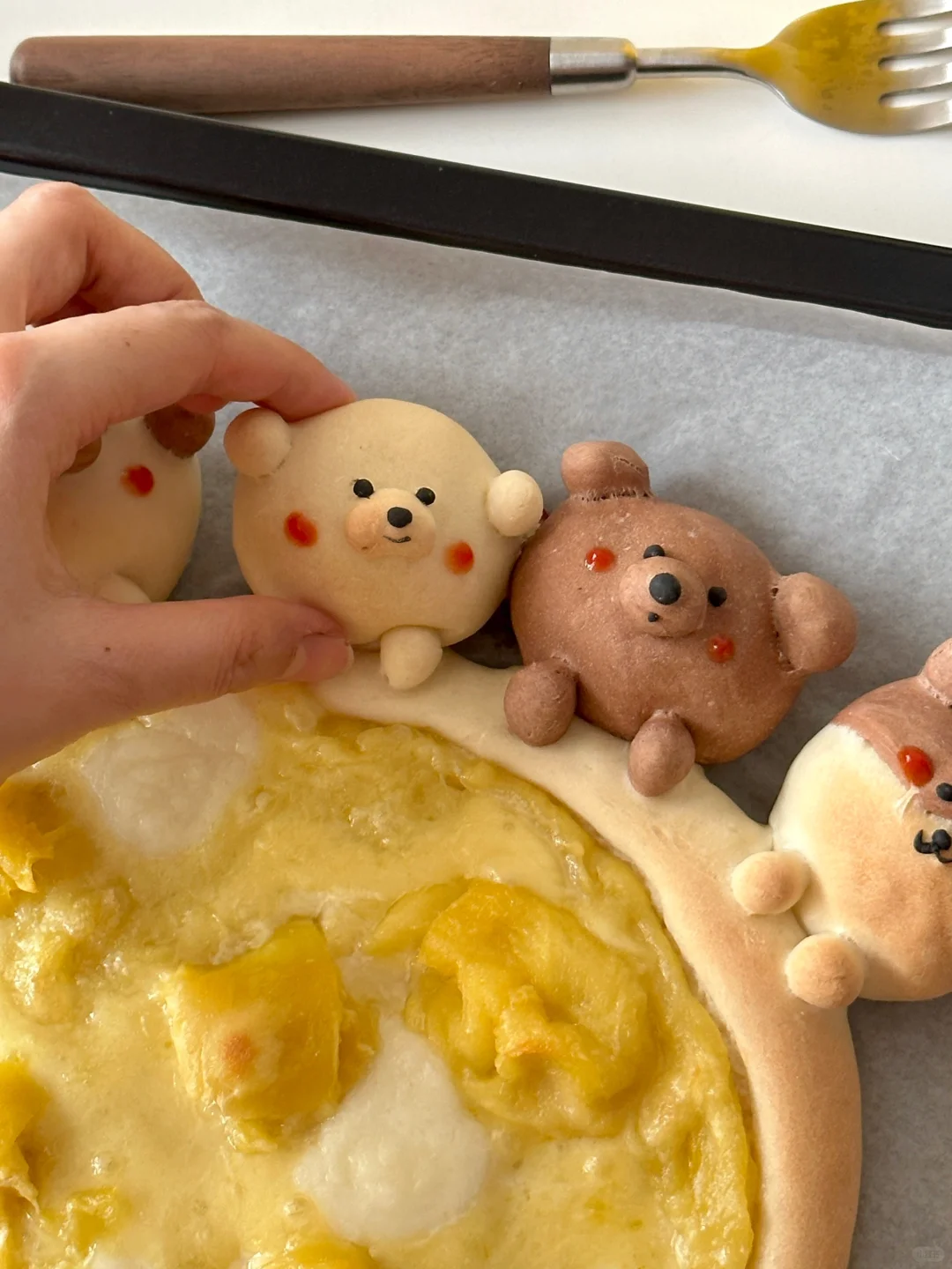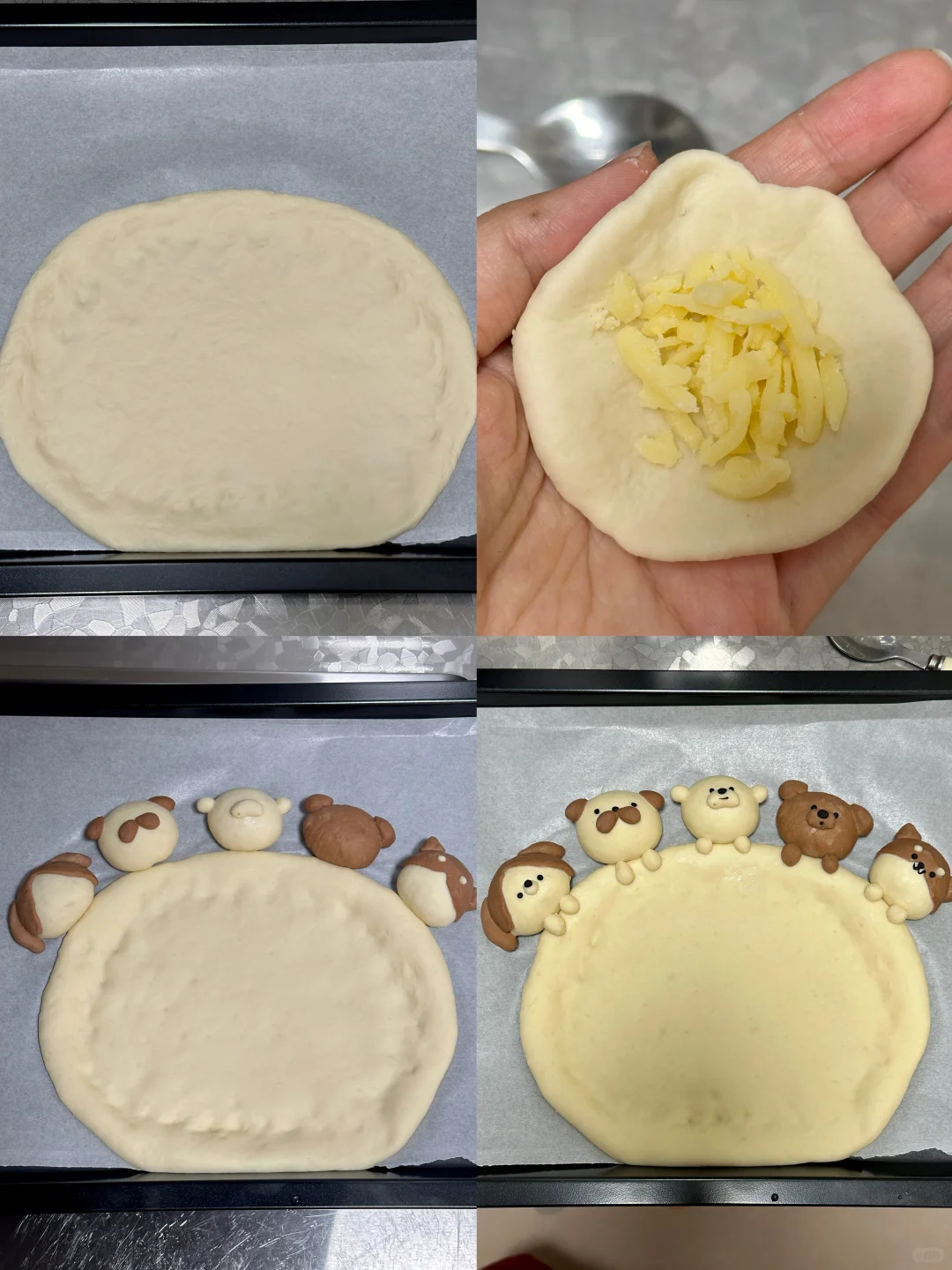 3️⃣面团排气揉光滑,分出150g制作小狗形象,剩下的制作披萨饼底