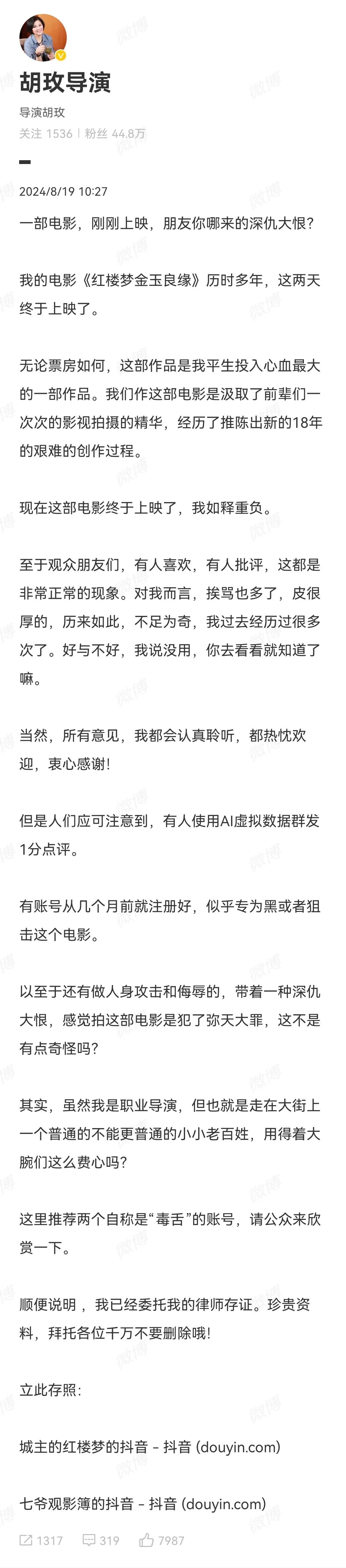 胡玫导演,连发两文,怒了! 《红楼梦之金玉良缘》终于上映,圆了当年没拍成剧版的遗憾。可是啊,胡玫想不到的是,除了提前准备好的差评,还有对主角的攻击。 虽然,作为第五代导演,她也算身经百战,感受了太多的褒贬,也不是第一次去接受非议。但是,她努力维护演员的心,她希望唤起观众去重读经典的心,不管怎么样,都是好的吧。 任何时代,任何人眼中,都会有经典,也都会出现挑战经典的一部分人,可能他们的作品并不尽如人意,但是依然应该佩服他们的勇气和挑战意识。 可能,更包容的心,才会让我们看到更多后来人的尝试,也才能让我们在多年之后重新去评判一些作品。就像《甄嬛传》,确实是初看之时很多人不觉得好,如今越看越上头的。 不过,还是要说一句,这波压力给到郑晓龙和流潋紫了,不知道能不能顶得住,会不会重新考虑之前的决定,大家对此怎么看呢? 胡玫:希望和更多的观众交流起来寻找热爱表达的你