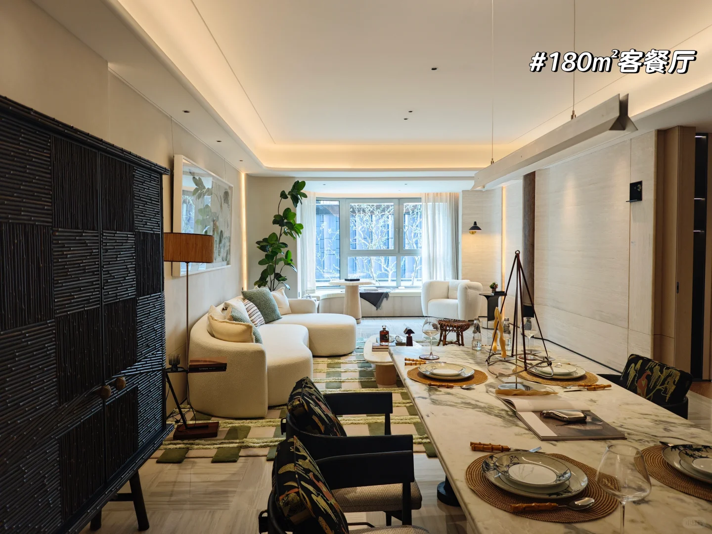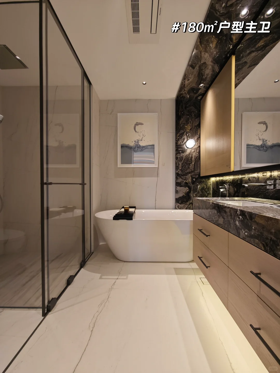 图10和11是180㎡的空间,这次室内空间的设计比起户型图来,真人走进去实际感官会好很多,屋内也和公区一样用了非常多的曲线和高级材料,整体现代风格,装标很高。