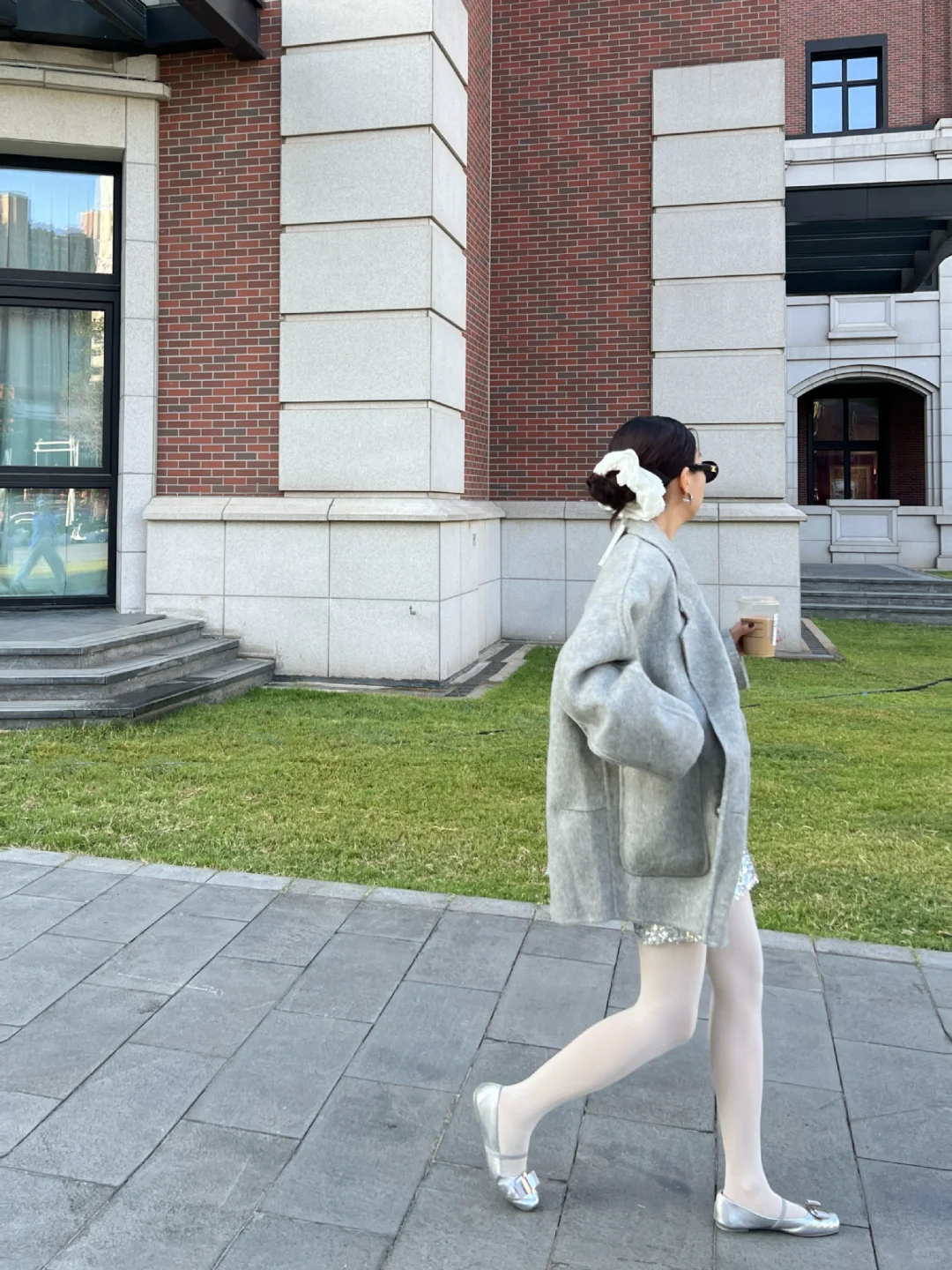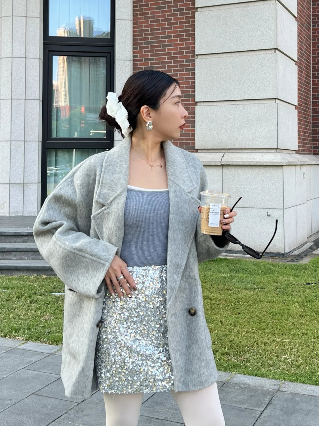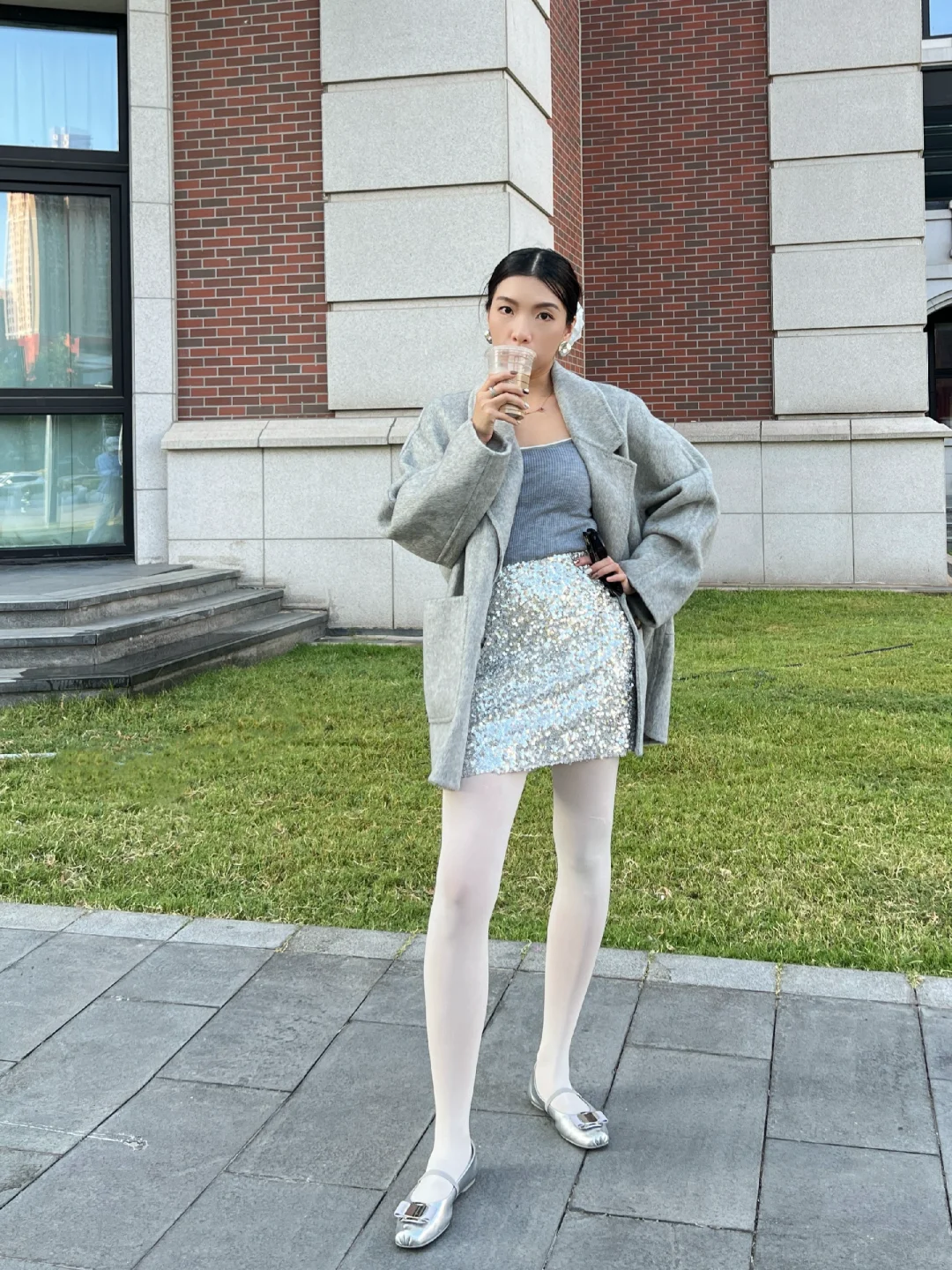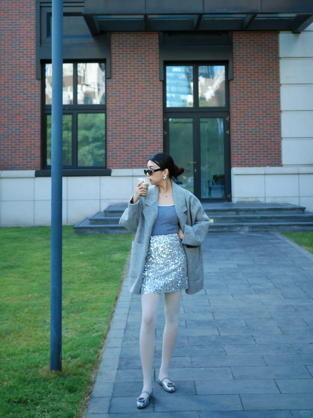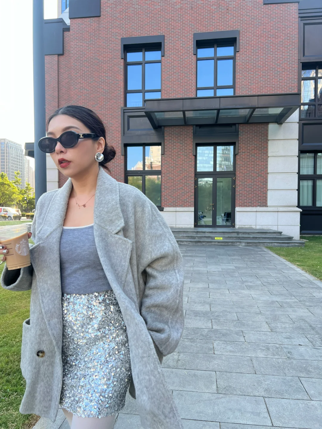 灰色呢子大衣🧥搭配亮片裙 秋冬我还是很喜欢灰色系