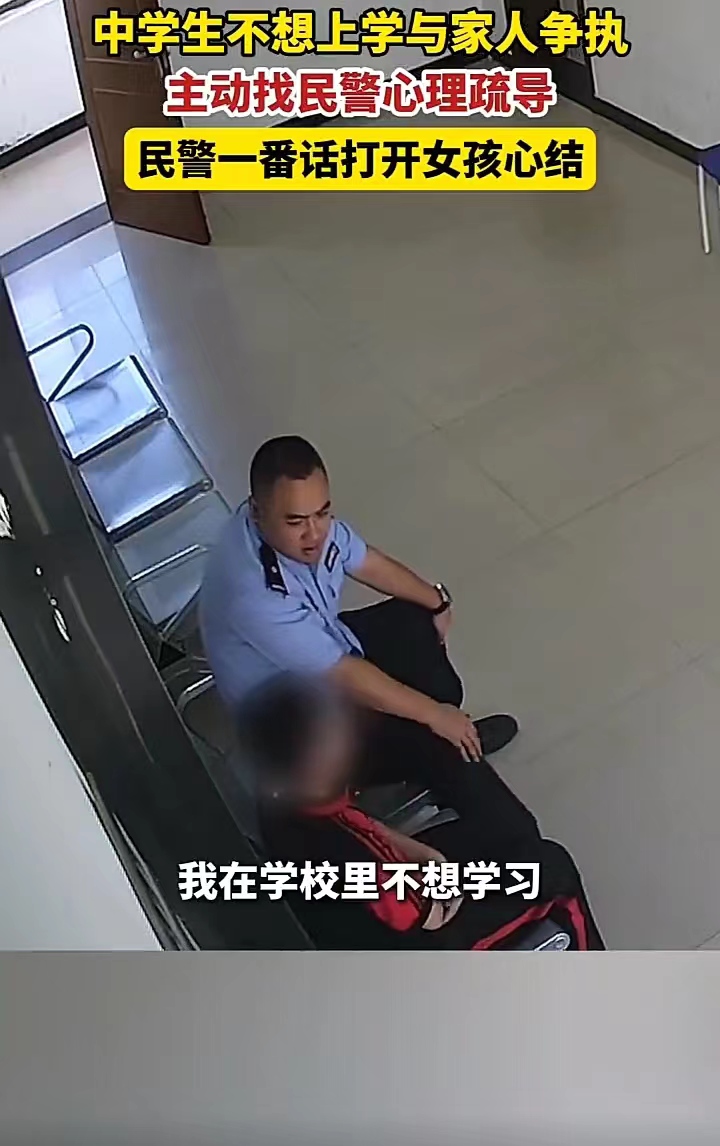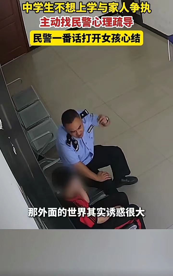 9月18日,湖北襄阳一个中学女孩因学习压力太大不想上学,与家人发生争执后,主动找到正在工作的民警,询问能否帮她做心理疏导,民警欣然答应,了解情况后劝慰道:“你的目光、格局、眼界,还没有打开,以后考个好大学,外面世界的诱惑其实很大,学习的时候顺其自然,不要给自己太大压力!”最终,女孩解开心结回家了。