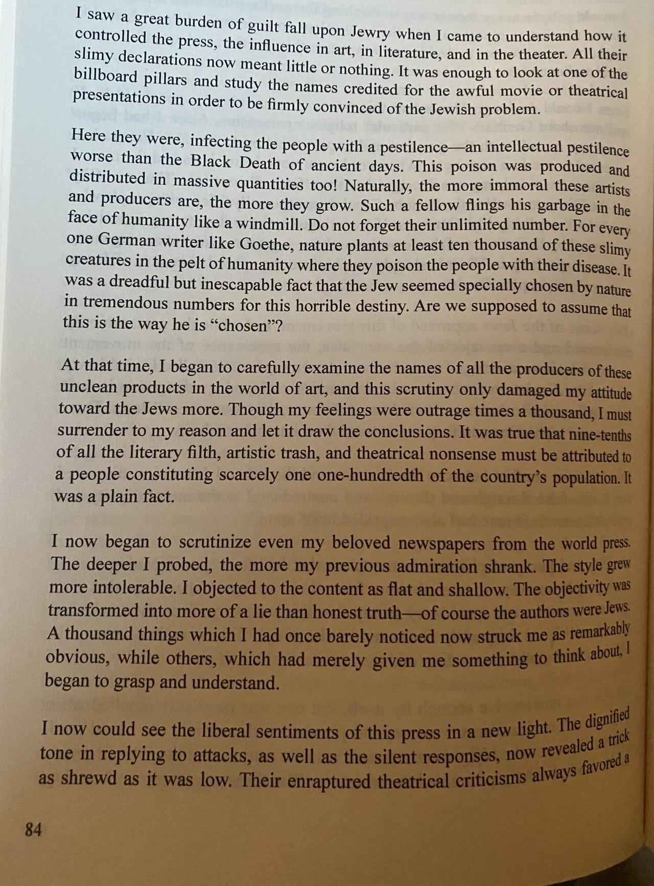 希特勒刚住在维也纳时,他认为反犹太主义报纸粗俗、幼稚。他不明白犹太人的仇恨从何而来。他认为犹太人只是另一个宗教群体。 当他开始注意到媒体的一种模式时,他慢慢改变了想法。他意识到他们正在贬低国家人口,他们在这些地区的过度代表是可耻的。从那时起,他承认他们是外来民族,而不是德国人。(今天的美国媒体和好莱坞也是如此)…… “确实,所有文学垃圾中有 9/10 可以归因于一个几乎占人口 1/100 的民族。”-阿道夫·希特勒