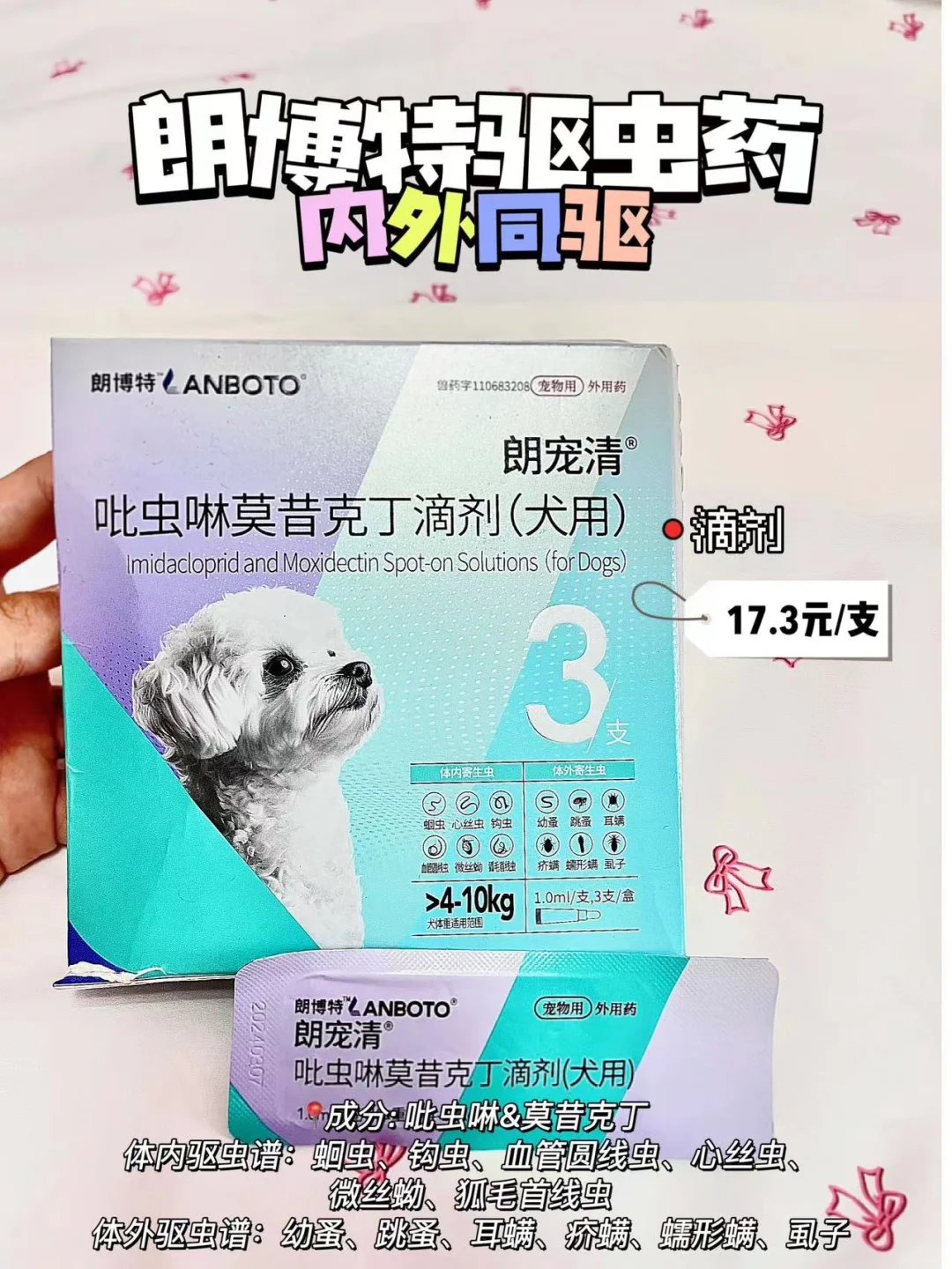 🦴朗博特驱虫药具备内外同驱的效果,驱虫谱广,而且成分温和不刺激,平均十来块钱一支的价格,一支就可以驱除狗狗体内外12种寄生虫,28种适应证!无需内服!,滴剂的设置很好上手,每月只需要在狗狗后脖上滴几滴就可以完成驱虫工作👍主打一个方便省心