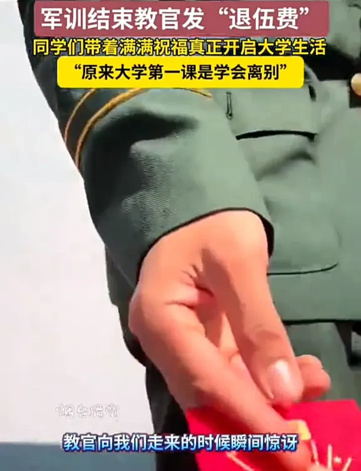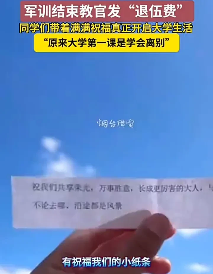 近日,山东烟台一名学生发视频称,学校组织的军训结束后,教官竟然给同学们发了“退伍费”,里面装着糖果、饼干、祝福小纸条等,虽然不是什么珍贵的东西,但却是意想不到的惊喜,很感谢教官们的用心。