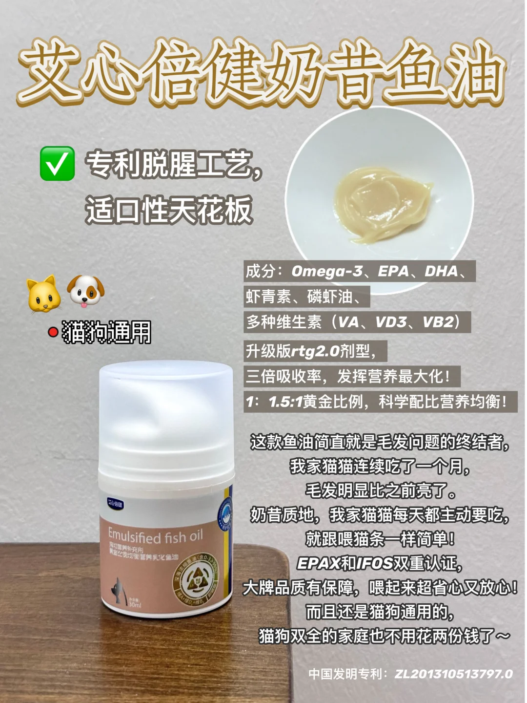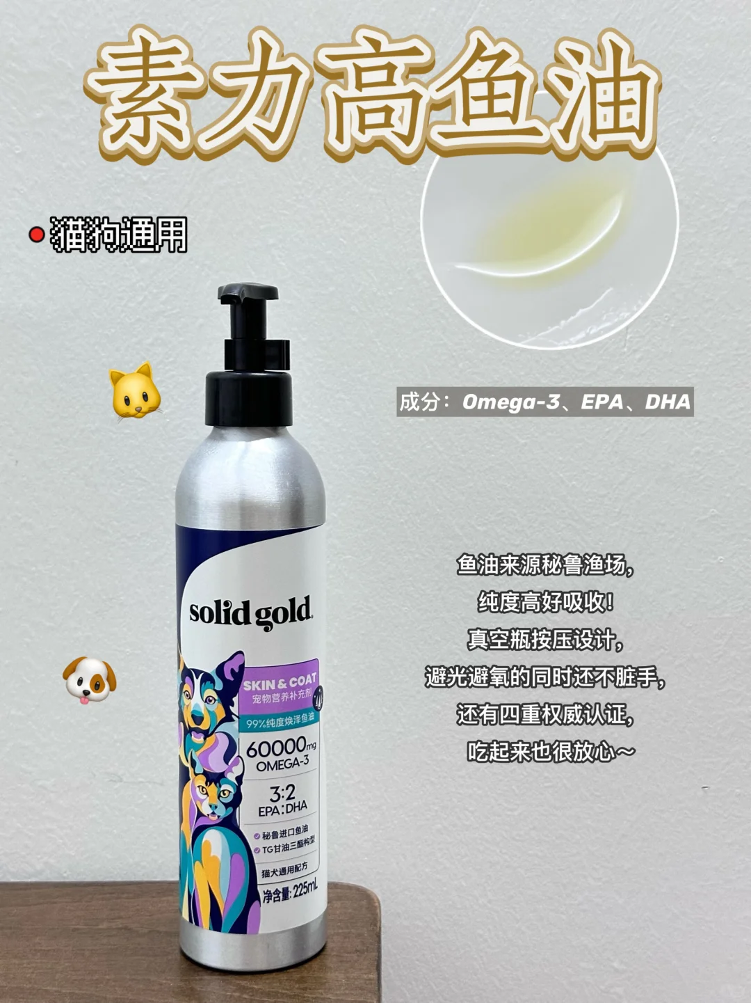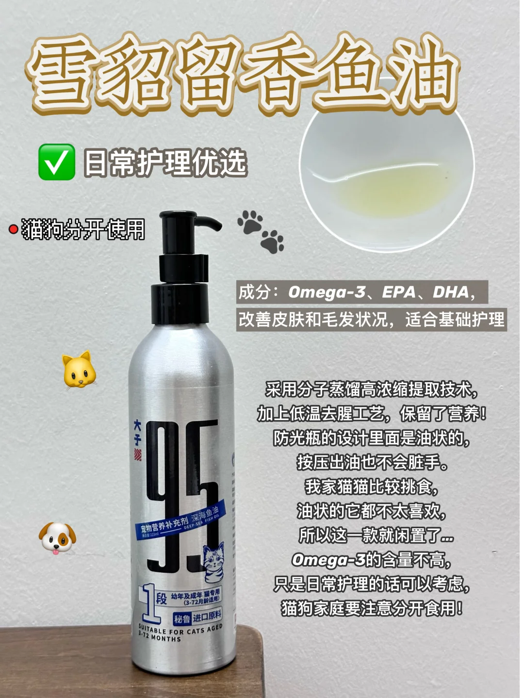 💬 猫狗分开的,采用分子蒸馏高浓缩提取技术,加上低温去腥工艺,保留了营养,防光瓶的设计,按压出油不会脏手。我家猫猫比较挑食,油状的它都不太喜欢,所以这一款就闲置了,日常护理的话可以考虑