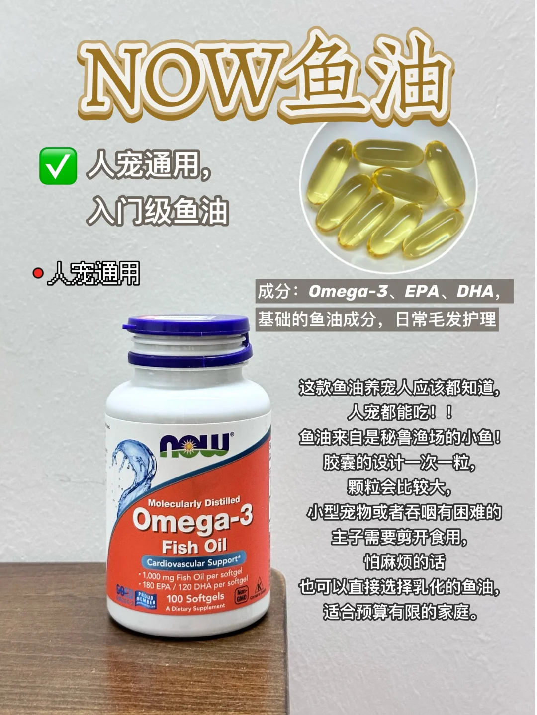 💬 养宠人应该都知道,人宠都能吃。鱼油来自秘鲁渔场,胶囊的设计一次一粒,颗粒会比较大,小型宠物或者吞咽有困难的主子需要剪开食用