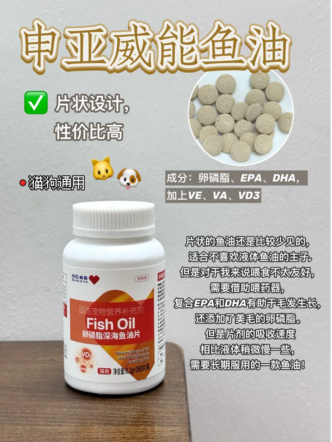 💬 片状的鱼油还是比较少见的,适合不喜欢液体鱼油的主子,但是喂食不太友好,需要借助喂药器,复合EPA和DHA有助于毛发生长,还添加了美毛的卵磷脂。片剂的吸收速度稍微慢一些,需要长期服用